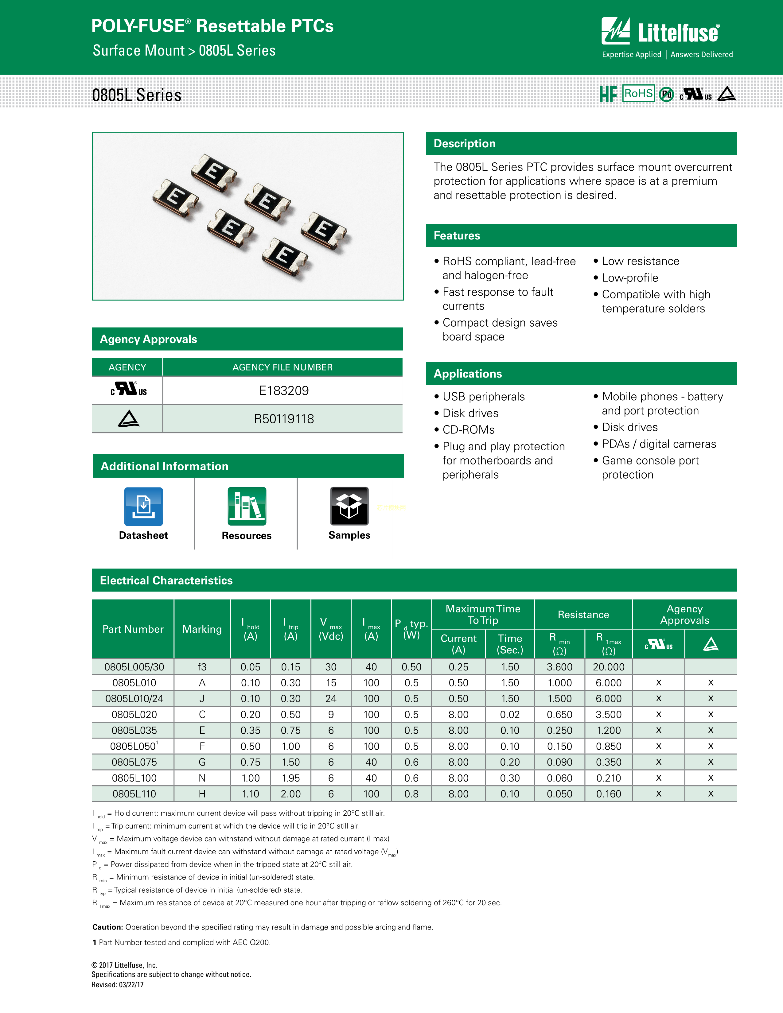0805L050WR数据手册0805封装Littelfuse(美国力特)PDF规格书,中英文下载