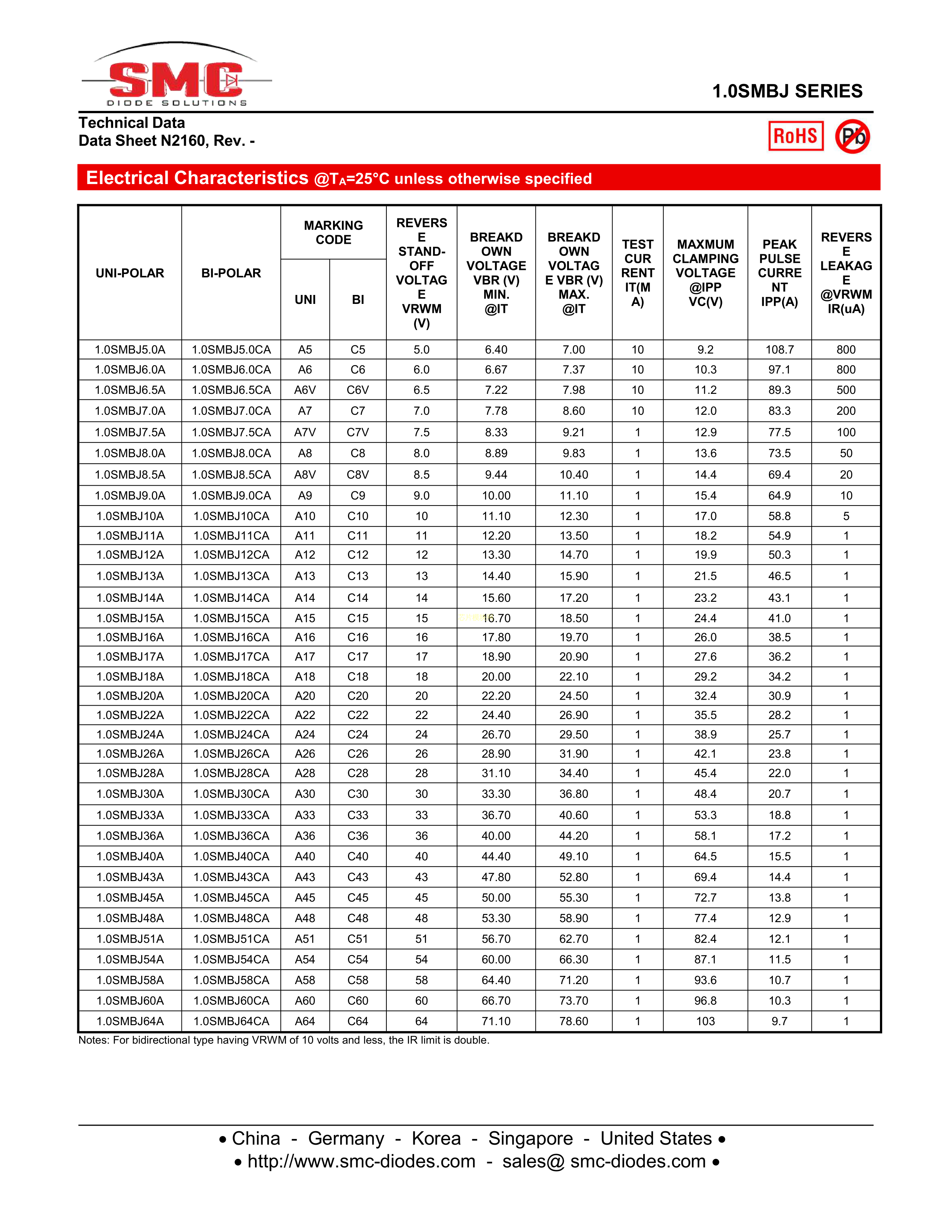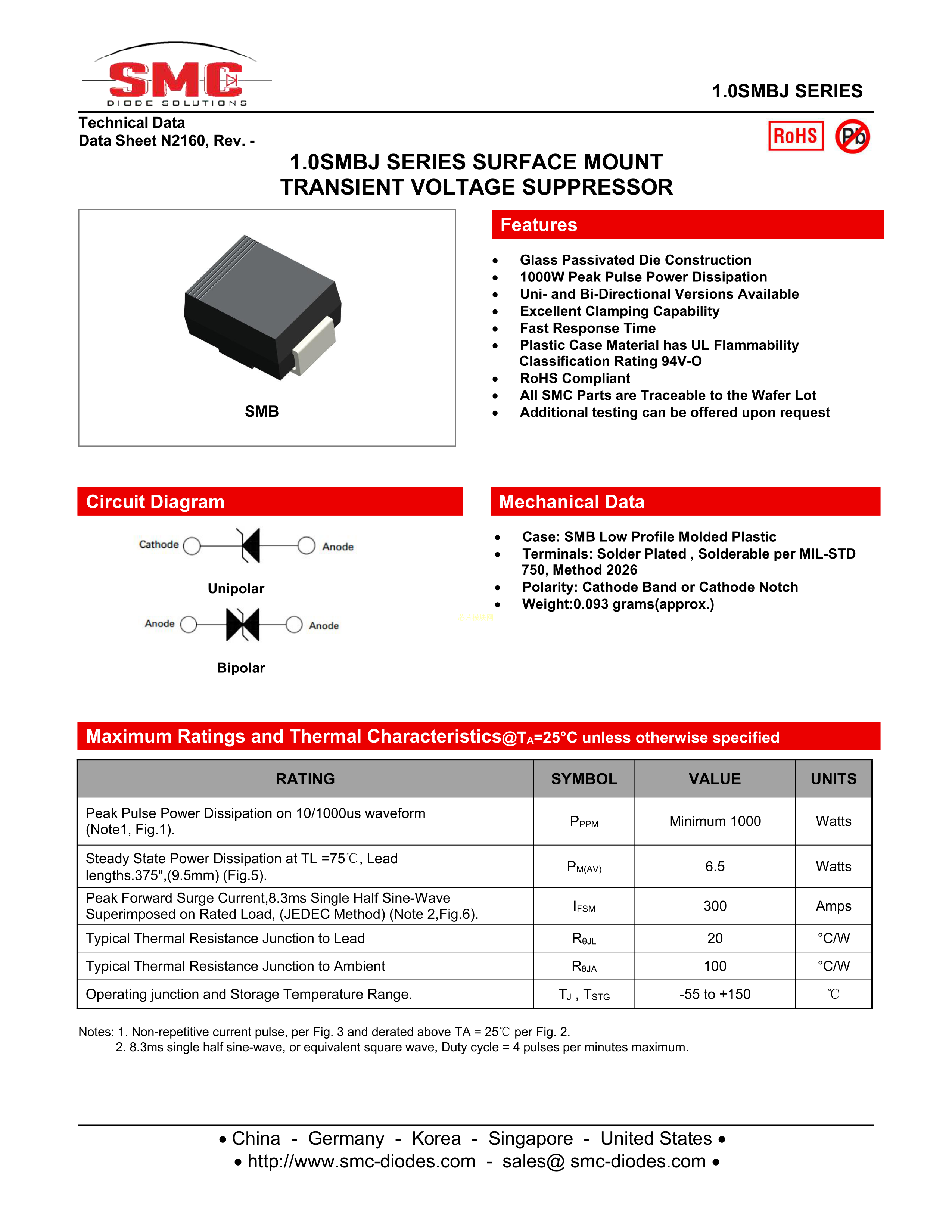 1.0SMBJ85CA数据手册SMB封装SMC(桑德斯)PDF规格书,中英文下载