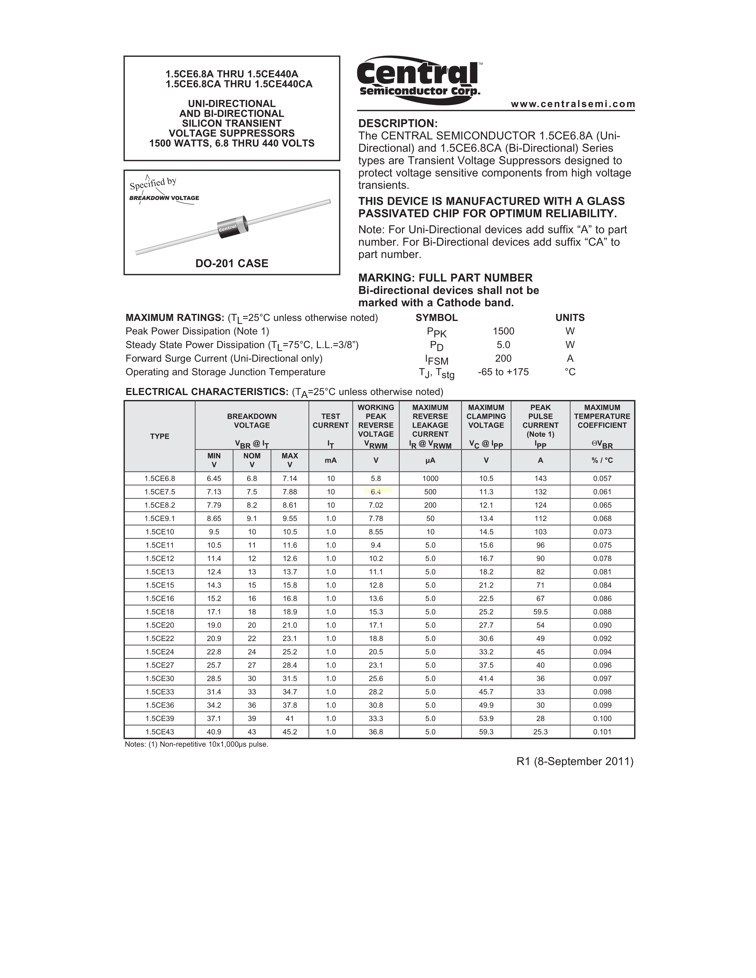 1.5CE16ABKPBFREE数据手册DO-201封装Central(中环)PDF规格书,中英文下