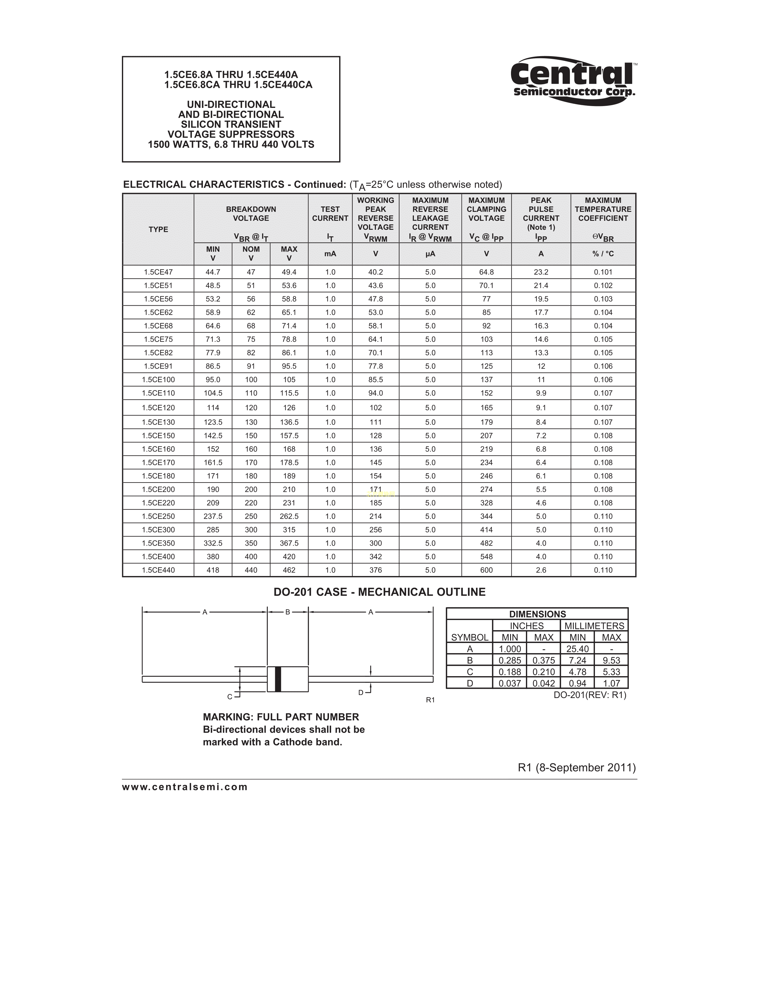 1.5CE24ATRPBFREE数据手册DO-201封装Central(中环)PDF规格书,中英文下