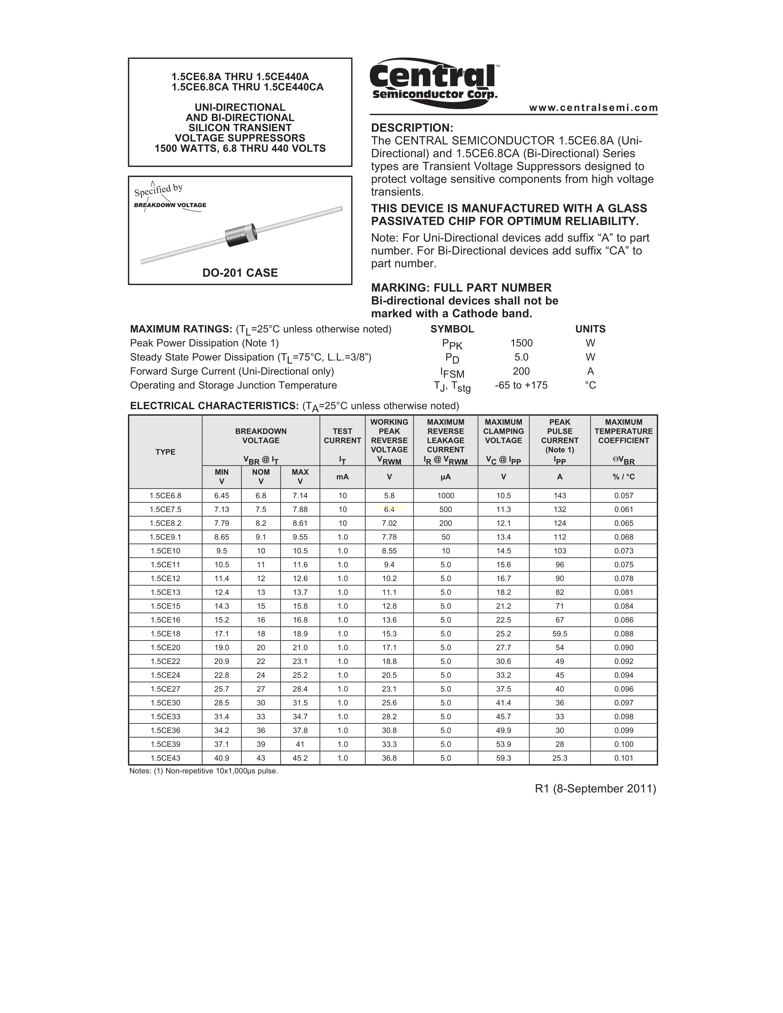 1.5CE47CABKPBFREE数据手册DO-201封装Central(中环)PDF规格书,中英文