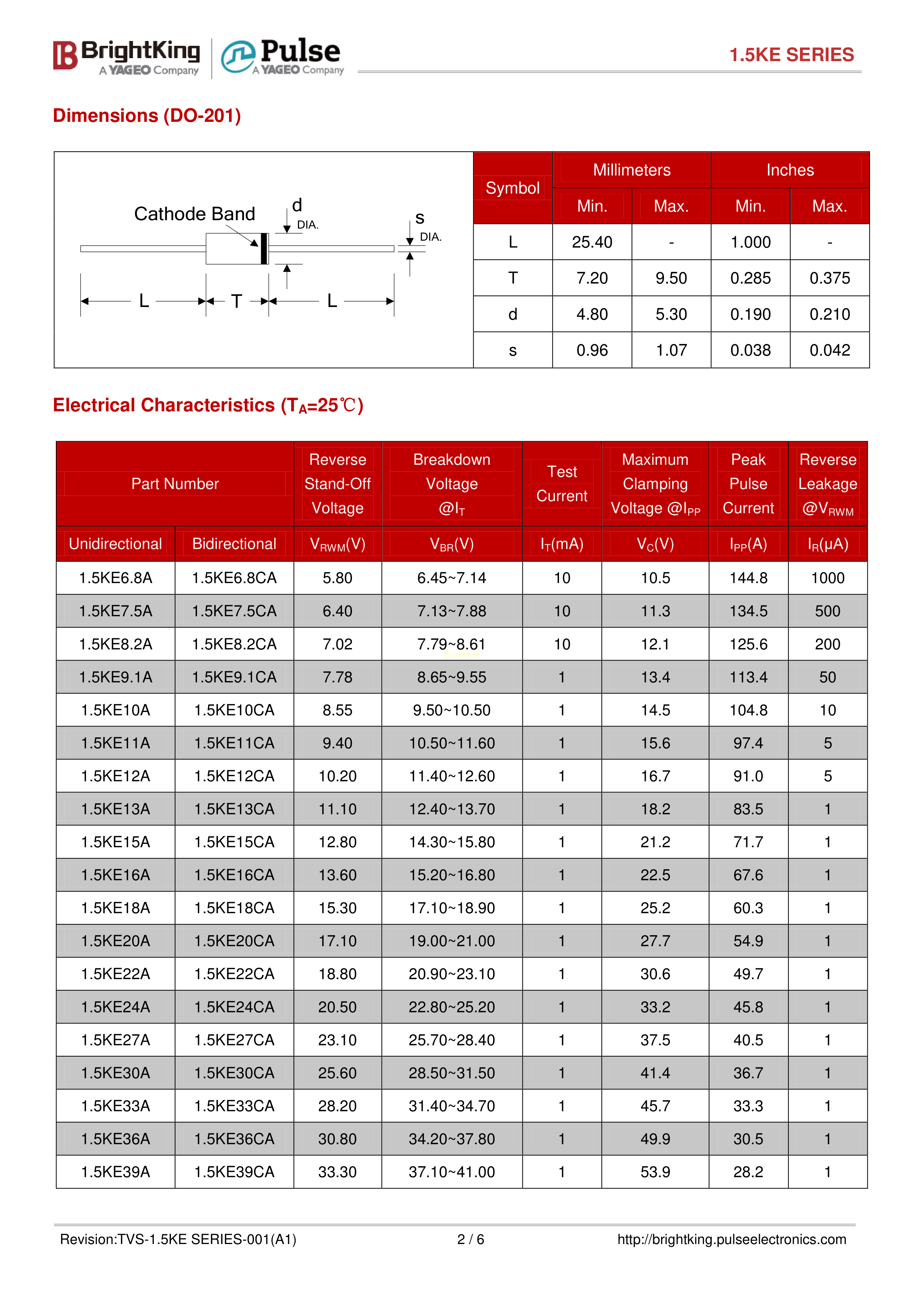 1.5KE22A数据手册DO-201封装Brightking(台湾君耀)PDF规格书,中英文下载