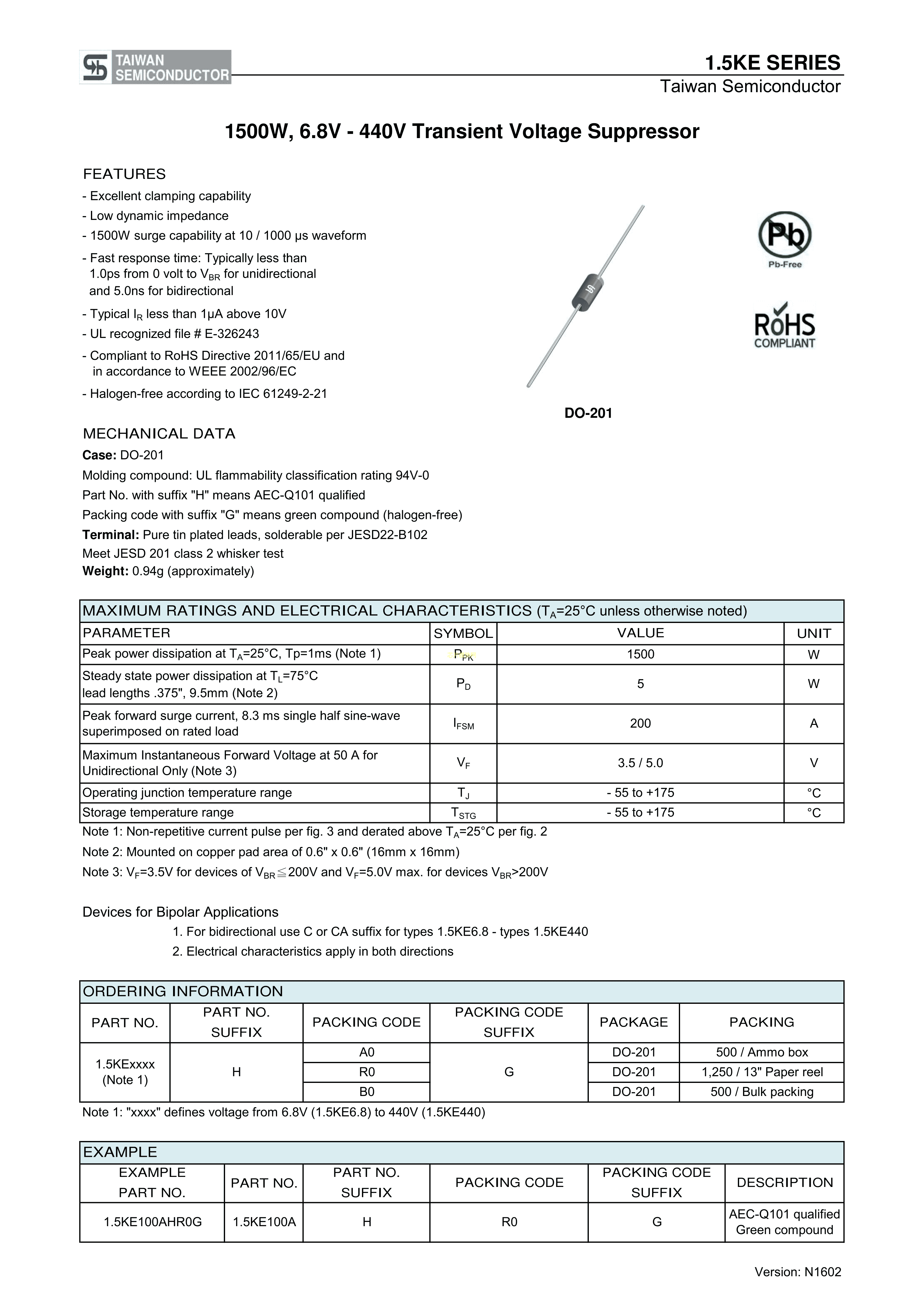 1.5KE33CAA0G数据手册DO-201封装TaiwanSemiconductor(台湾半导体)