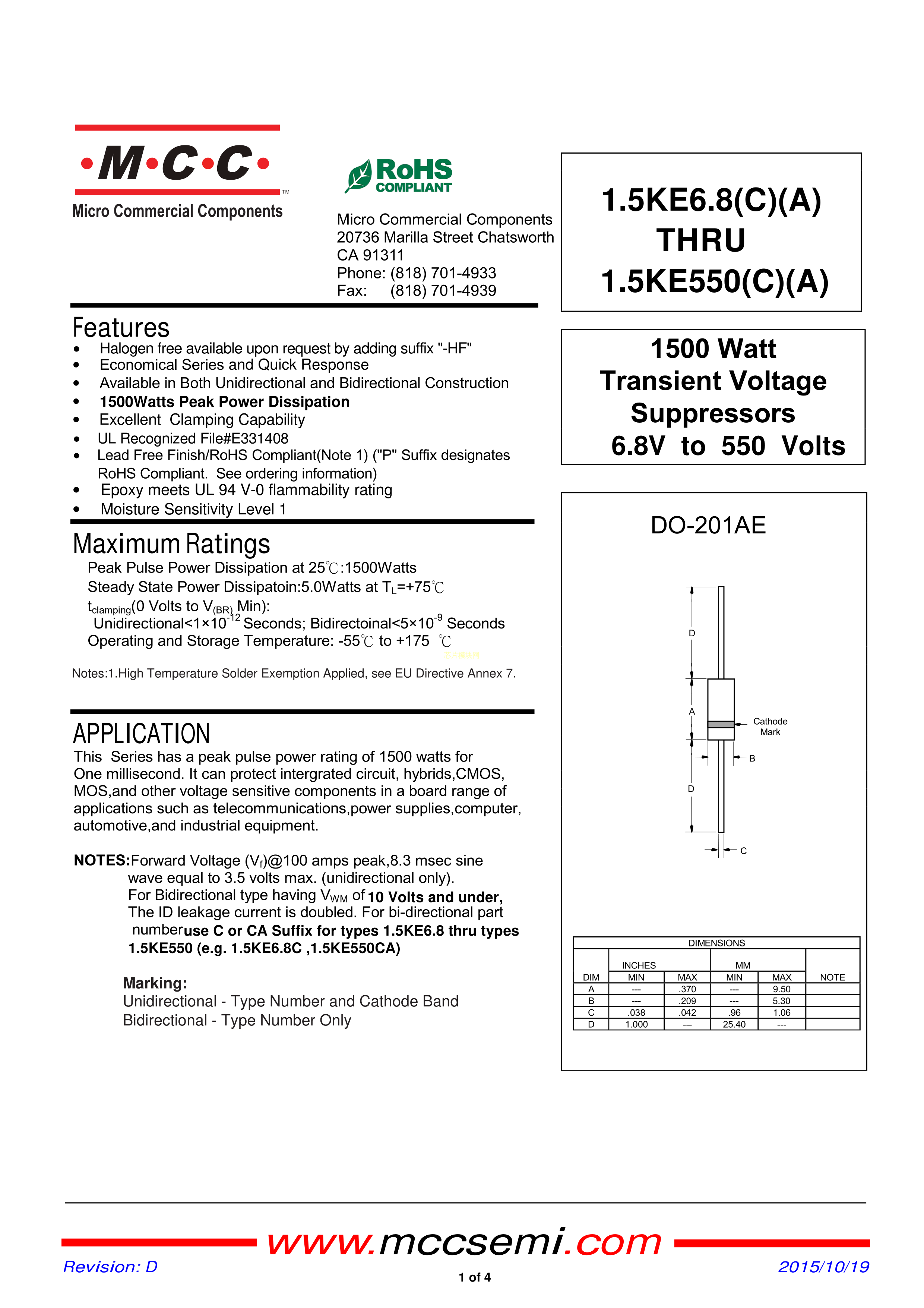 1.5KE36A-BP数据手册DO-201AE封装MCC(美微科)PDF规格书,中英文下载