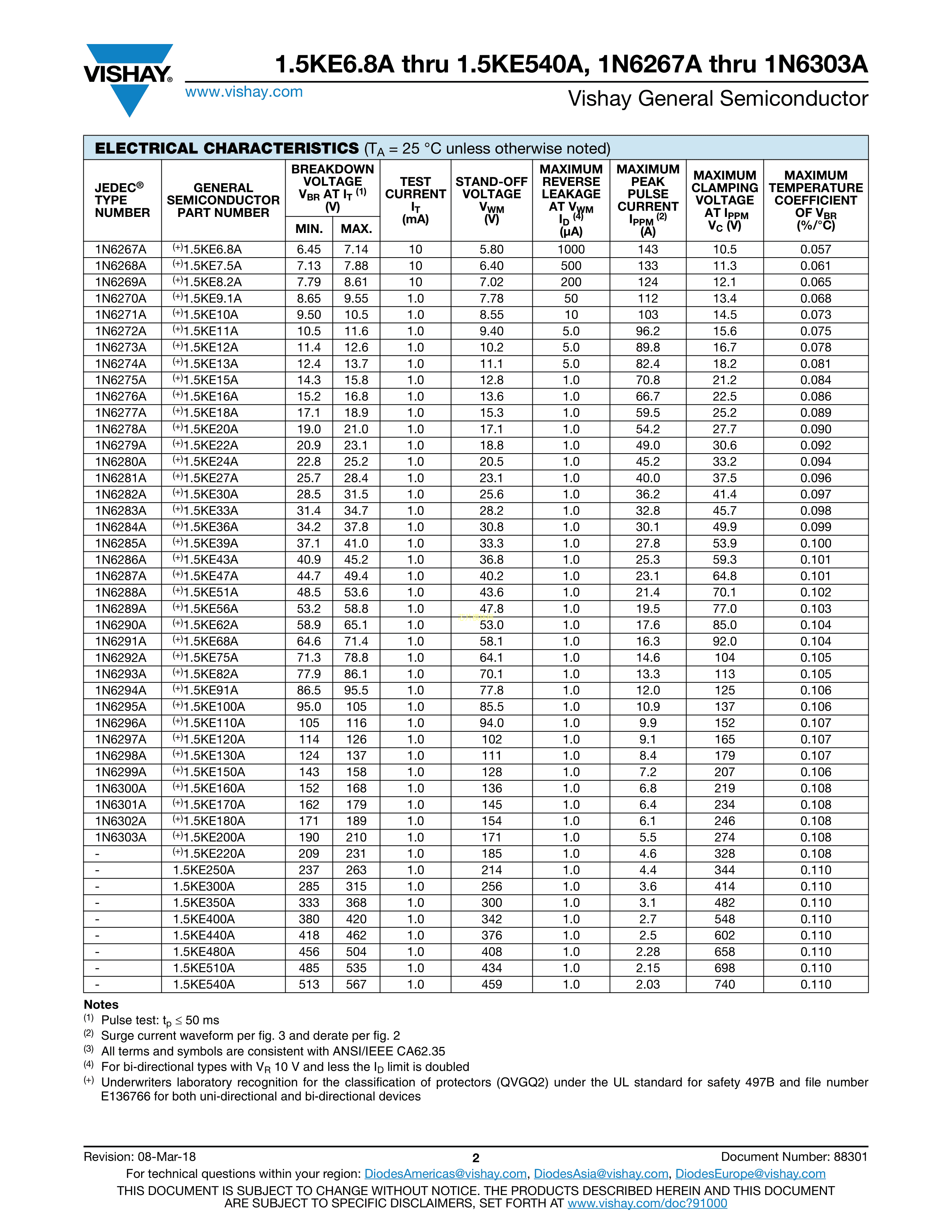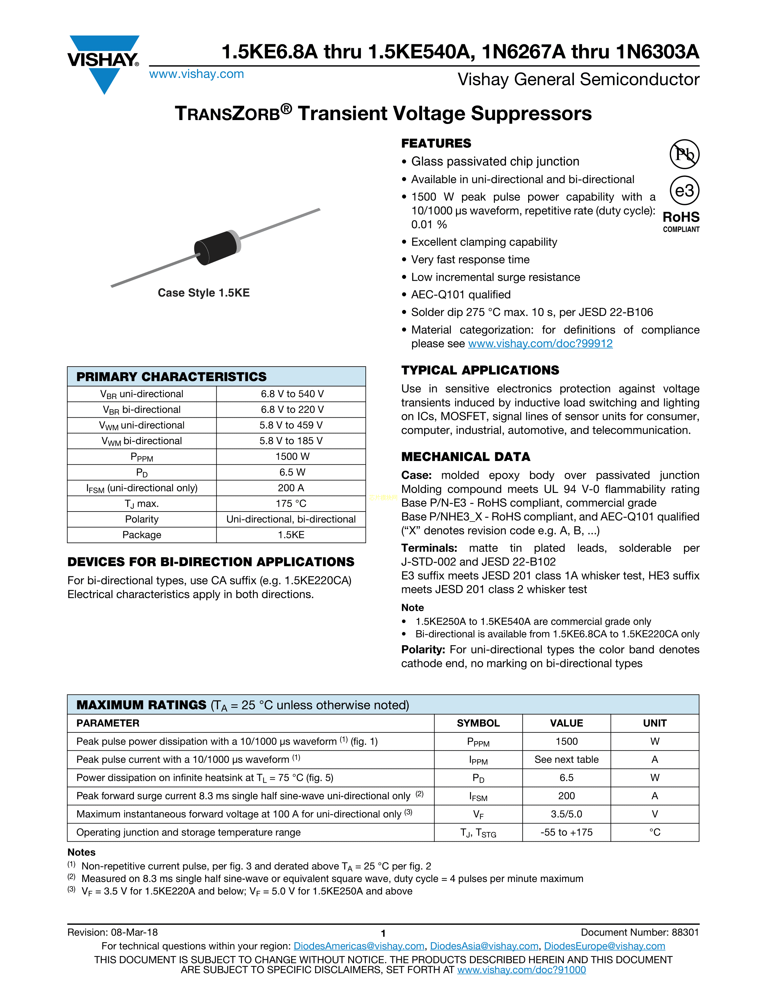 1.5KE6.8CA-E3-54数据手册Axial封装VISHAY(威世)PDF规格书,中英文下载