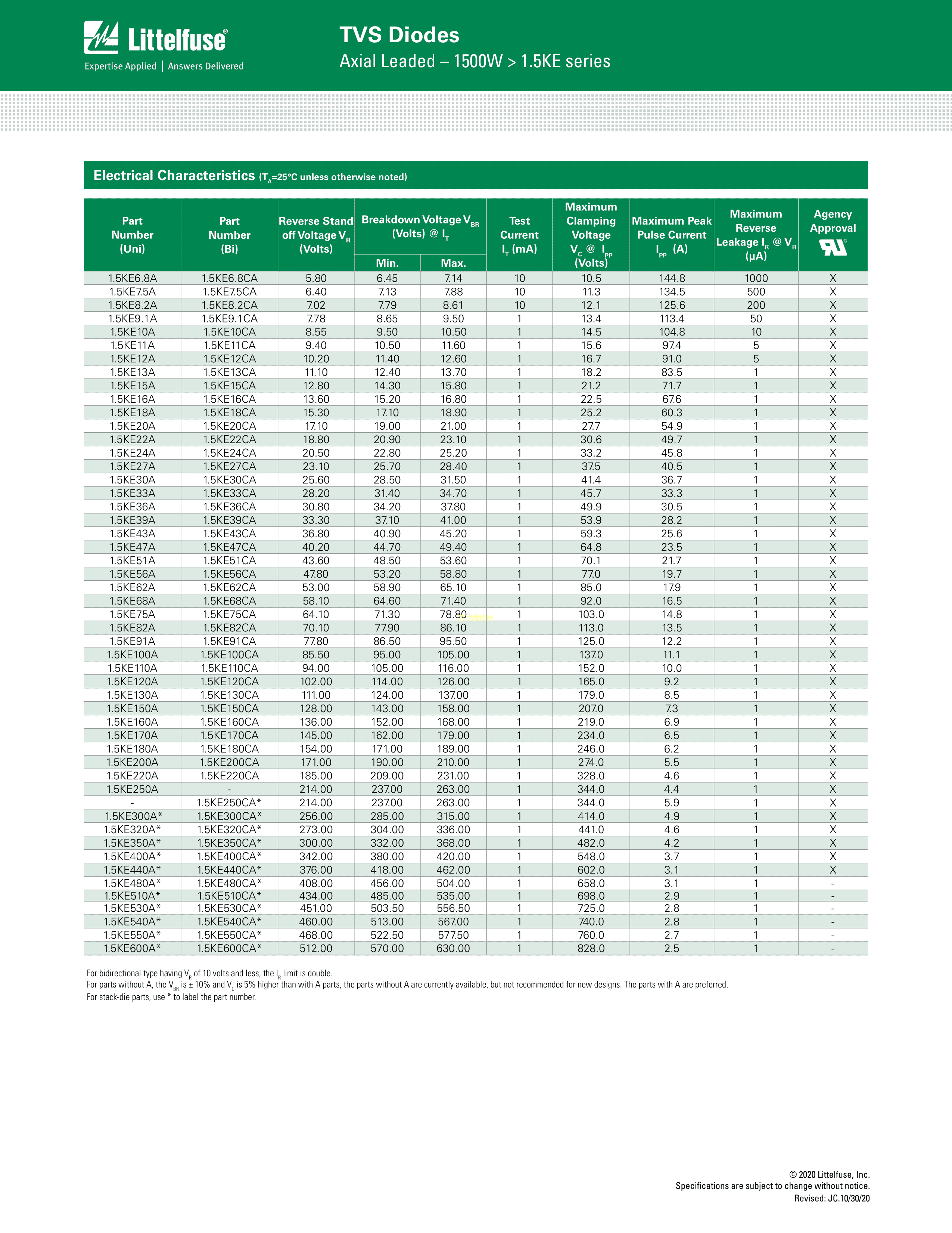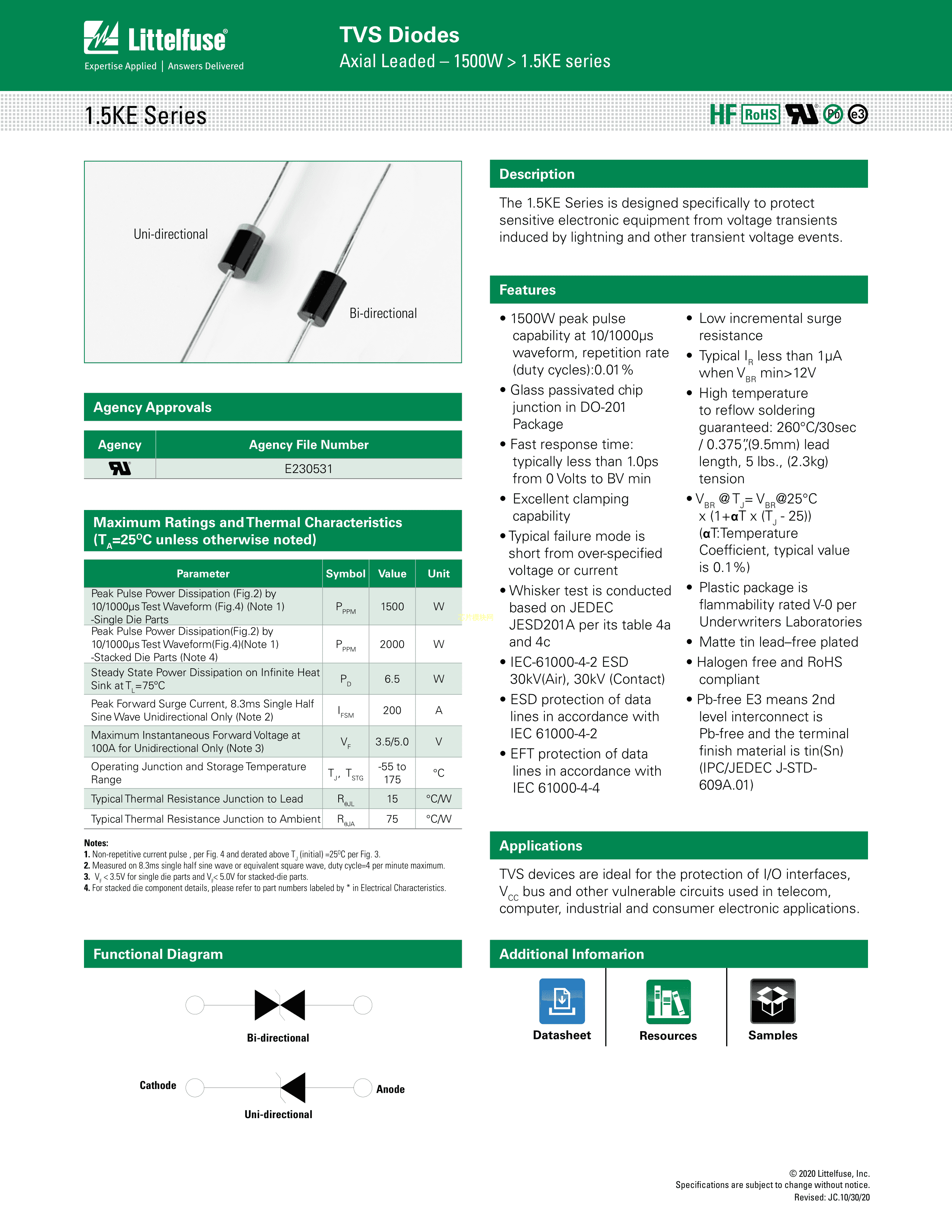 1.5KE7.5A-B数据手册DO-201封装Littelfuse(美国力特)PDF规格书,中英文下载