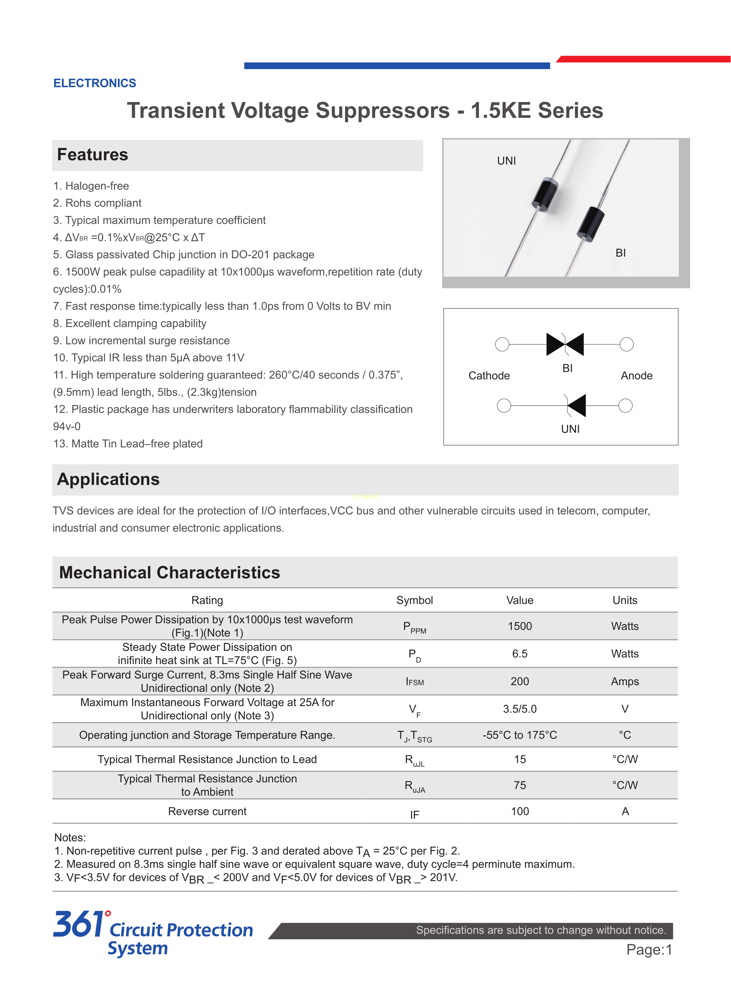 1.5KE7.5CA数据手册DO-201AD封装RUILON(瑞隆源)PDF规格书,中英文下载