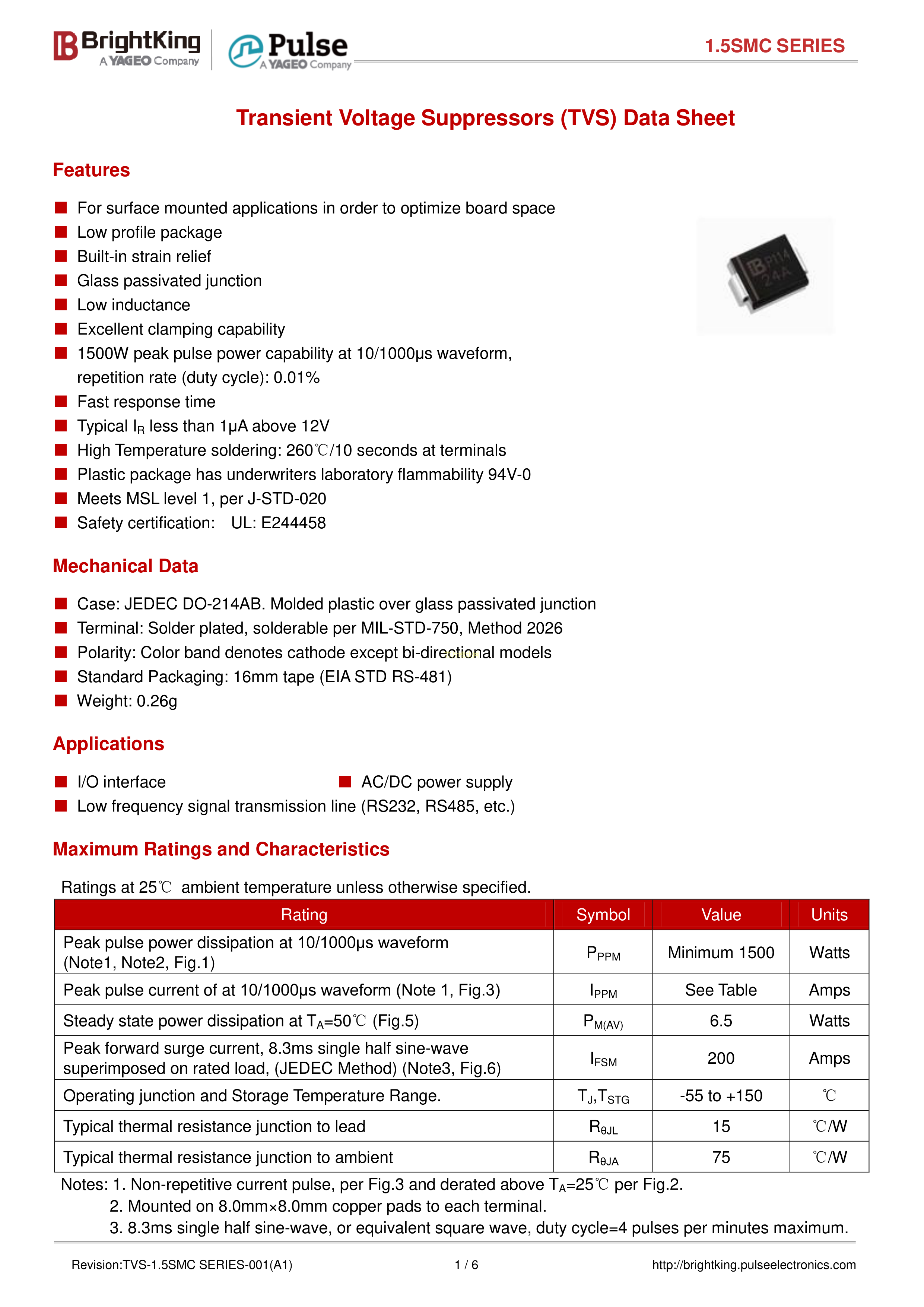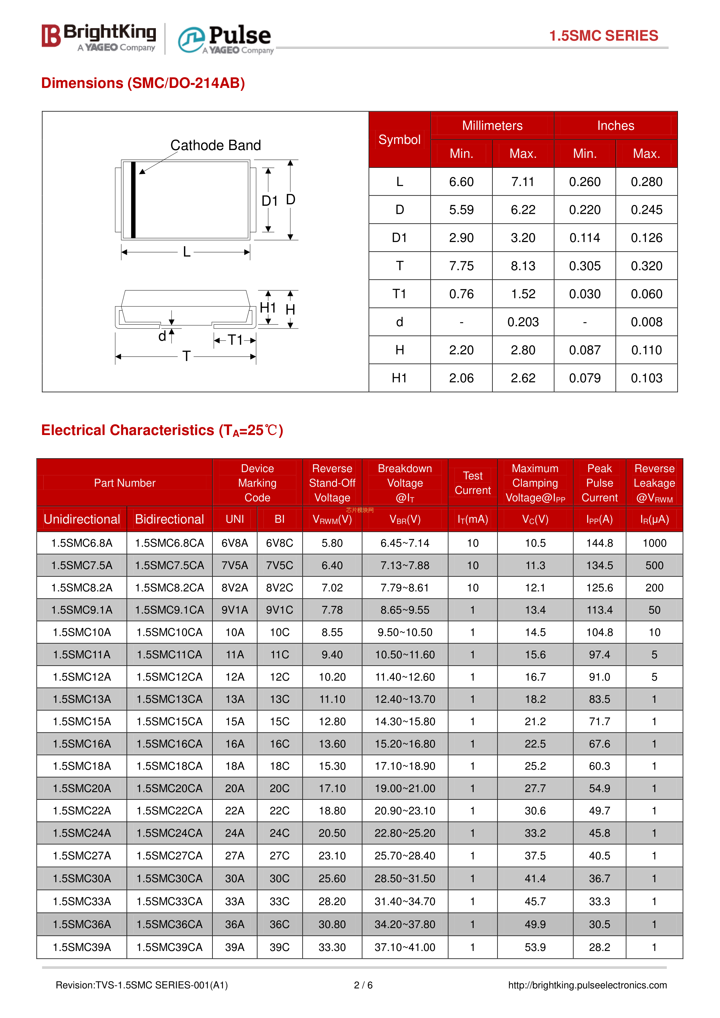 1.5SMC220CA-TR13数据手册DO-214AB封装Brightking(台湾君耀)PDF规