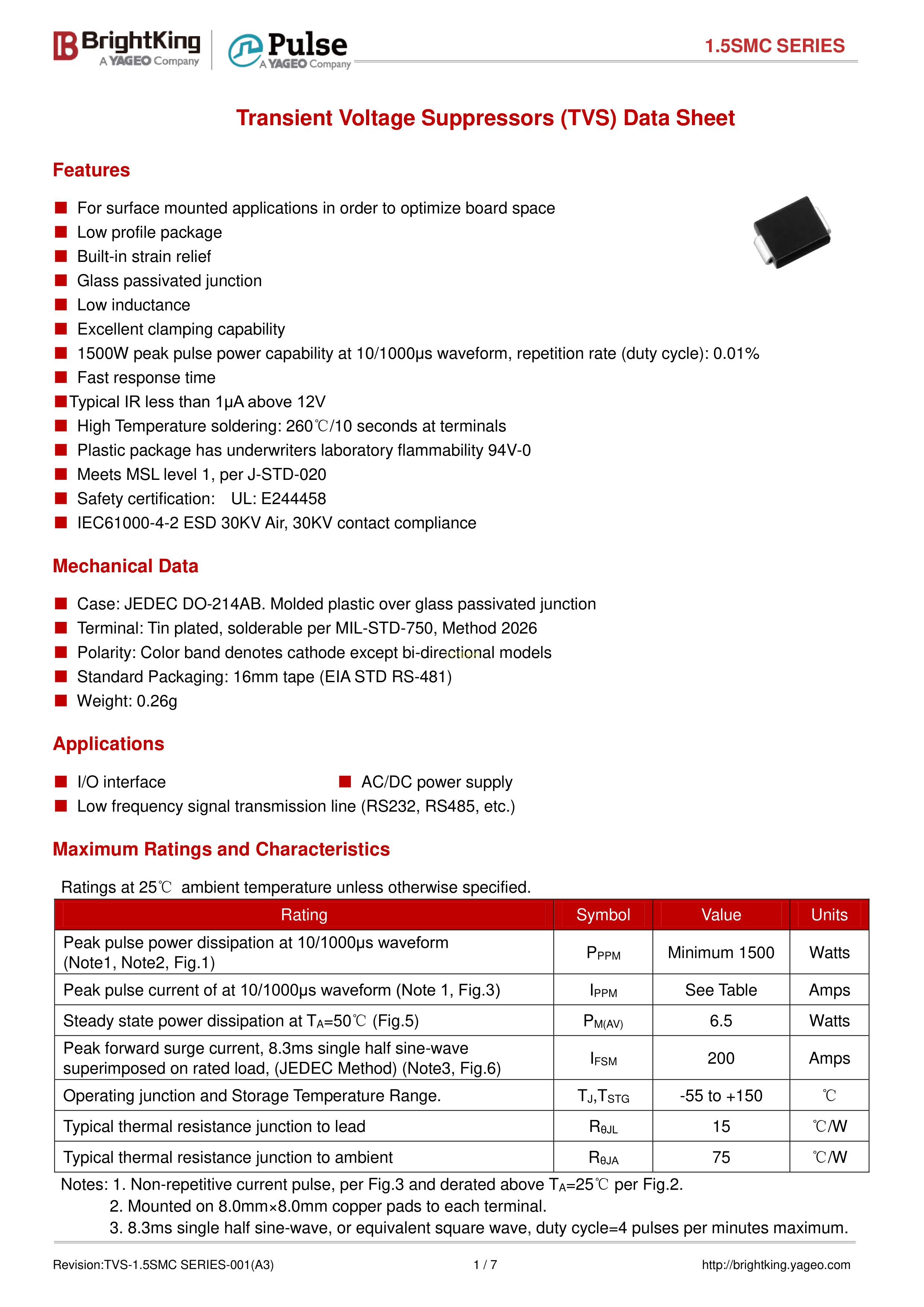 1.5SMC250CA-TR13数据手册DO-214AB封装Brightking(台湾君耀)PDF规