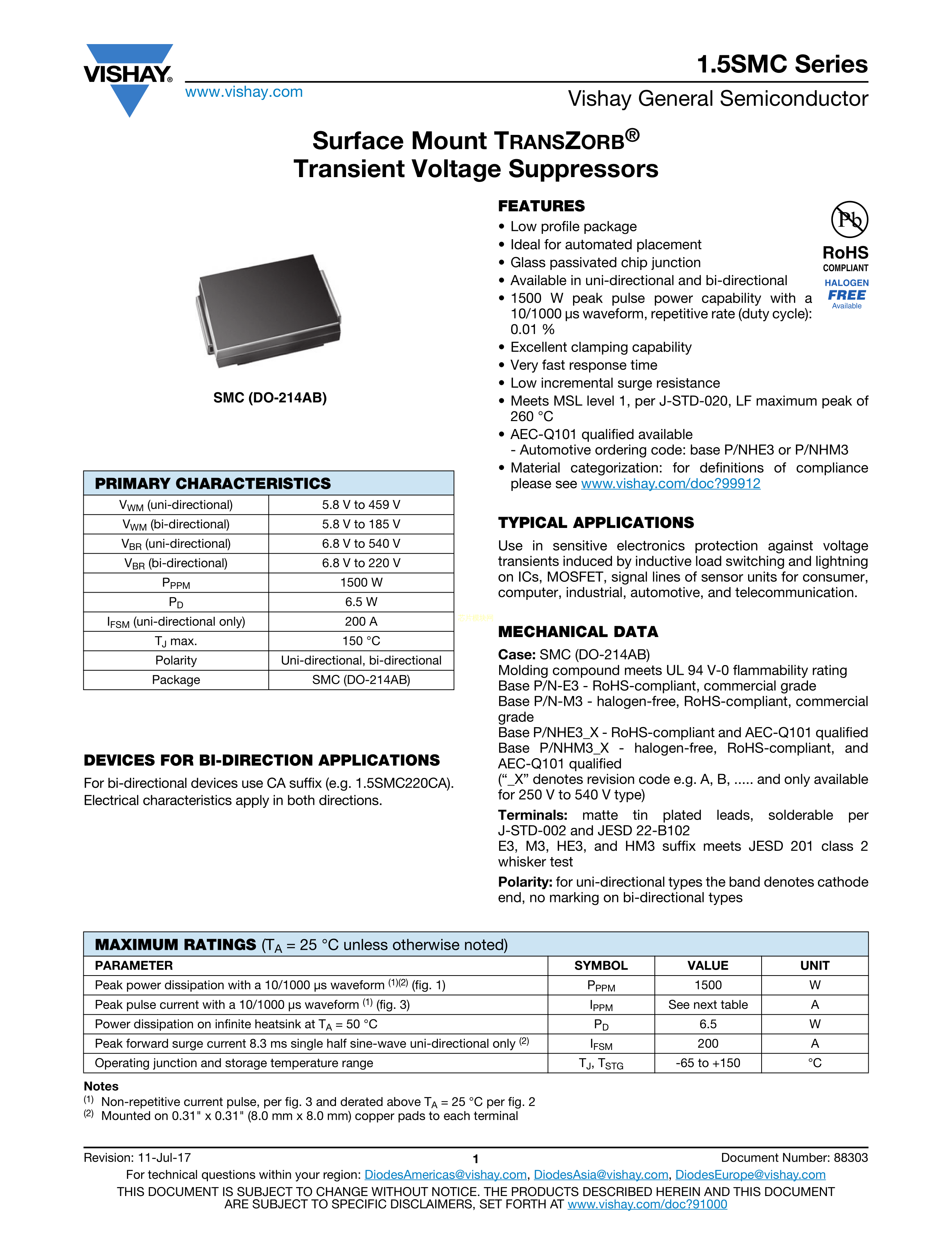 1.5SMC39CA-E3-57T数据手册SMC封装VISHAY(威世)PDF规格书,中英文下载