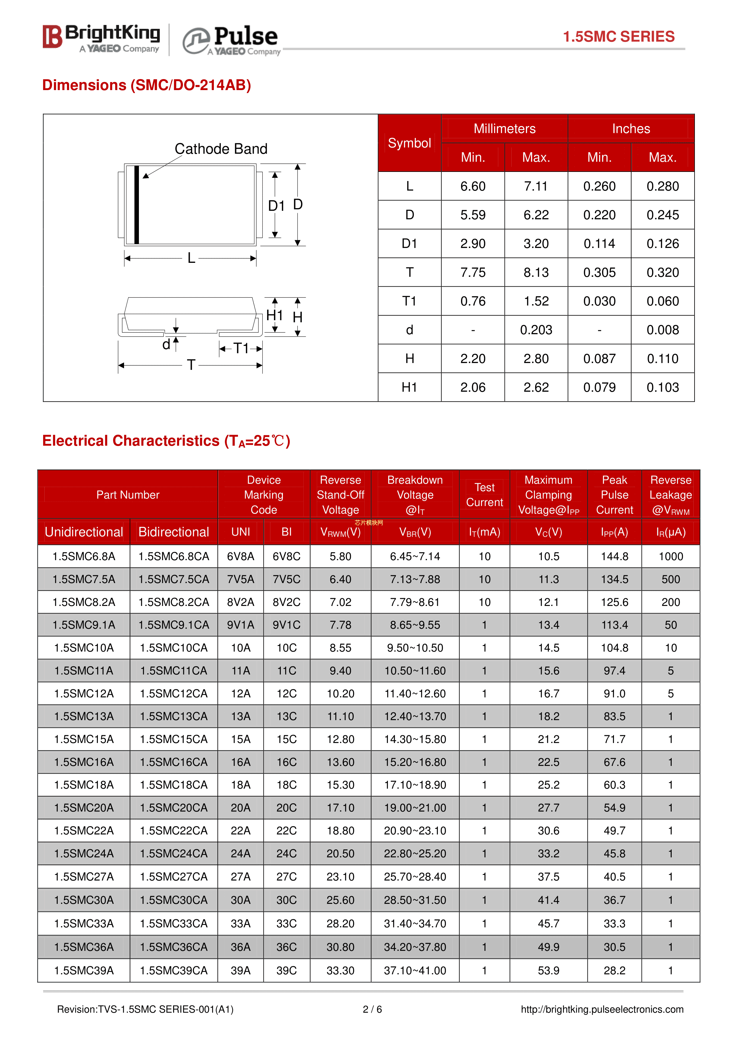 1.5SMC75A数据手册SMC封装Brightking(台湾君耀)PDF规格书,中英文下载