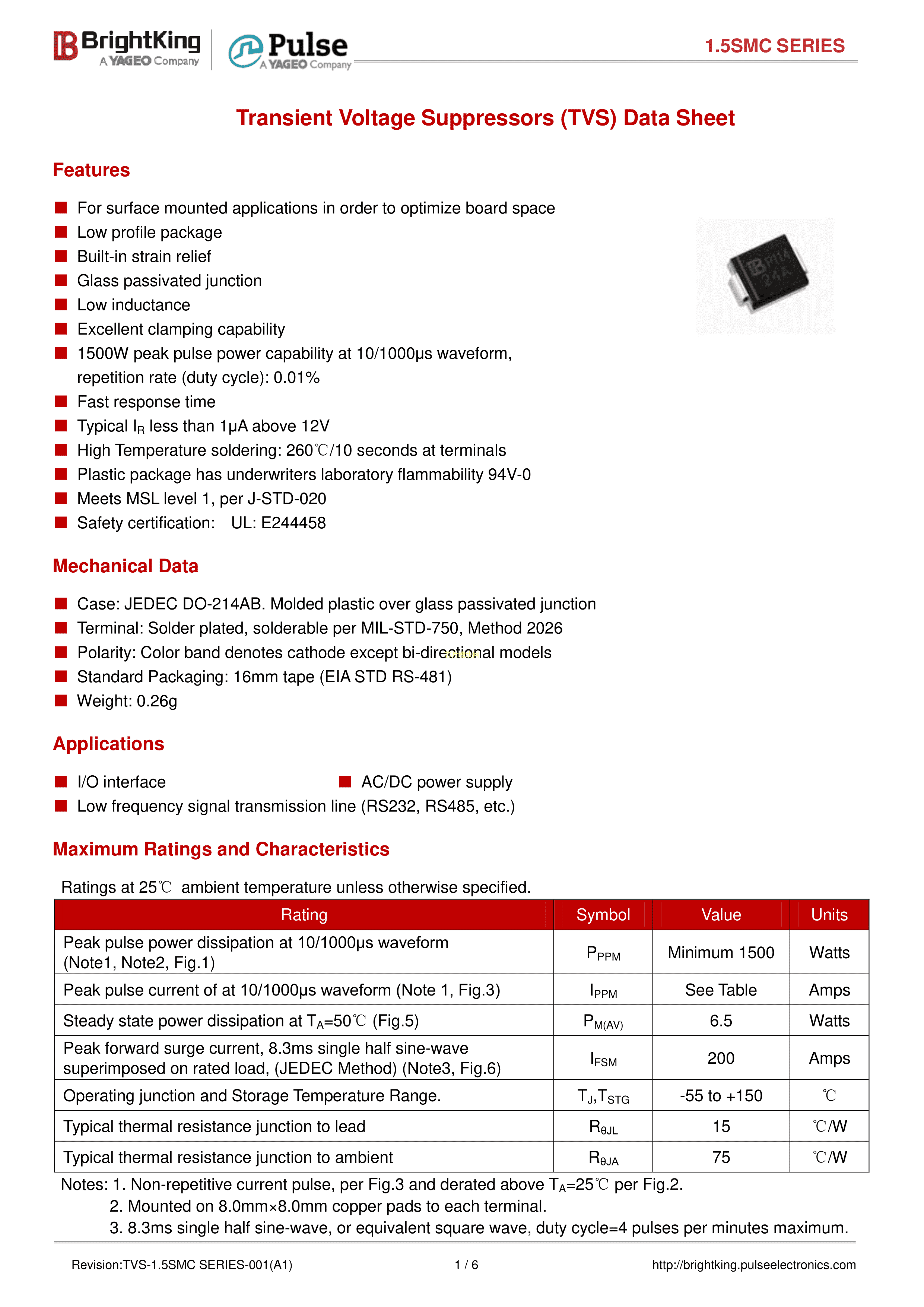 1.5SMC75CA数据手册SMC封装Brightking(台湾君耀)PDF规格书,中英文下载