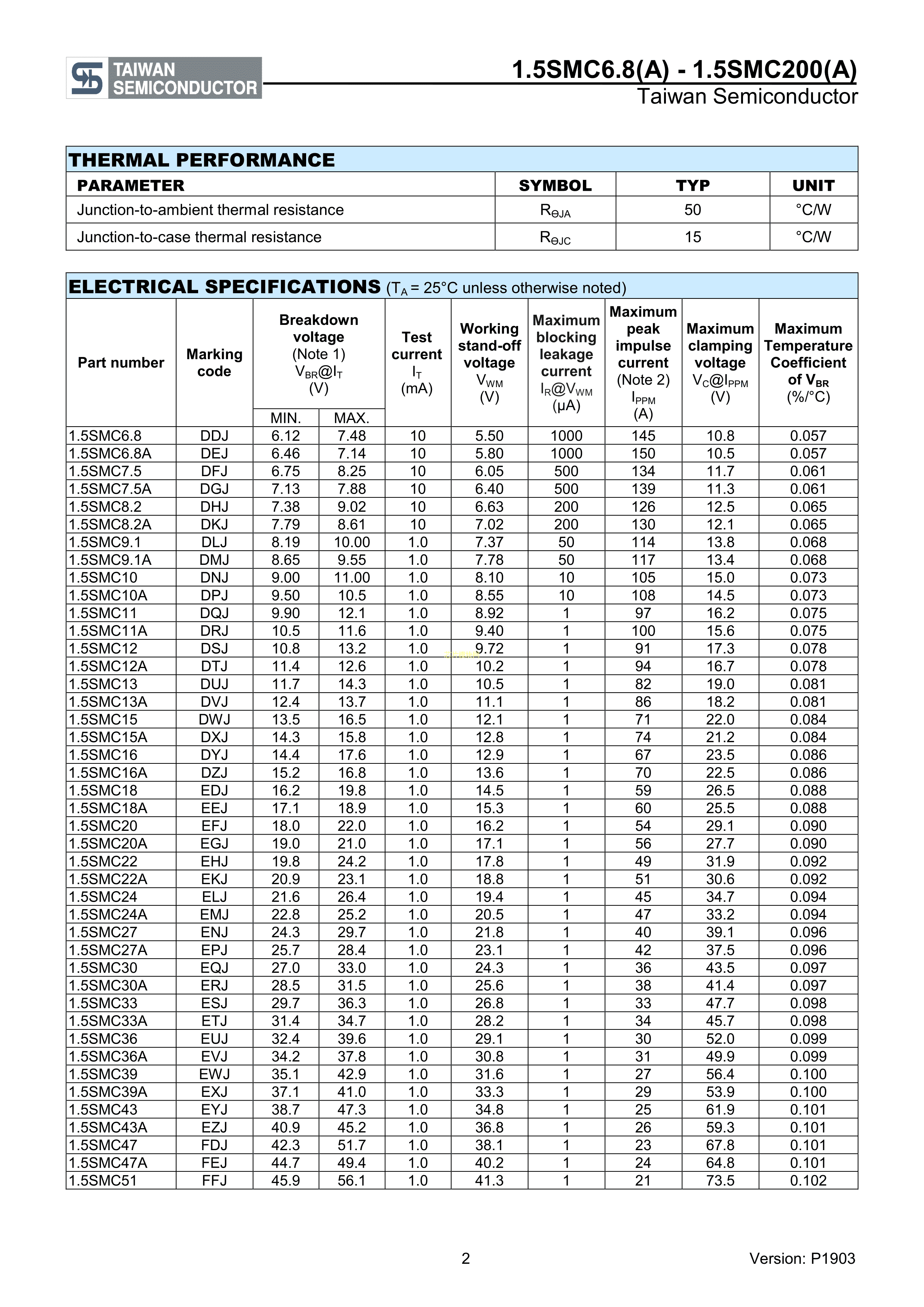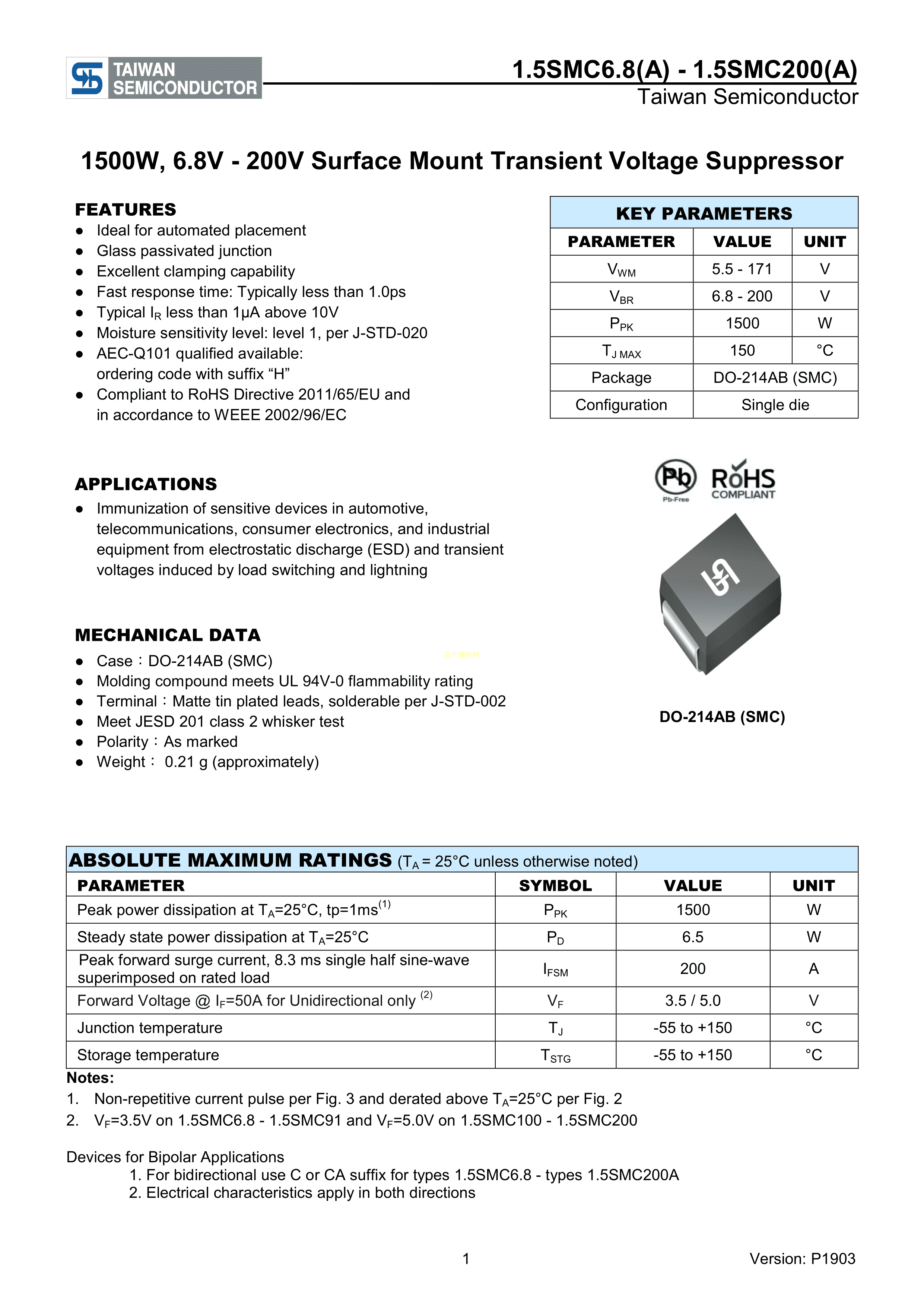 1.5SMC82AV7G数据手册MatrixSMC封装TaiwanSemiconductor(台湾半导体)PDF规格书,中英文下载
