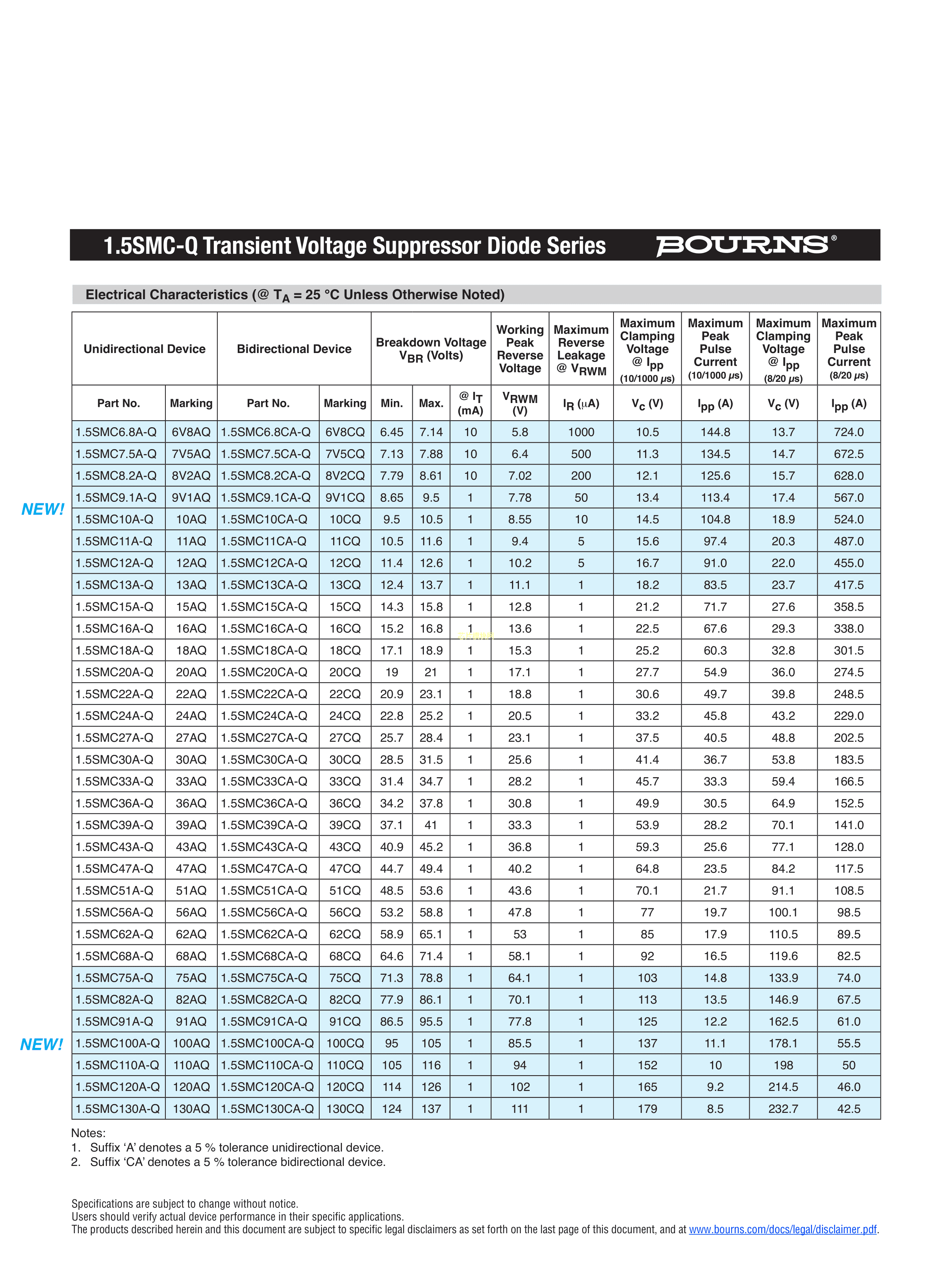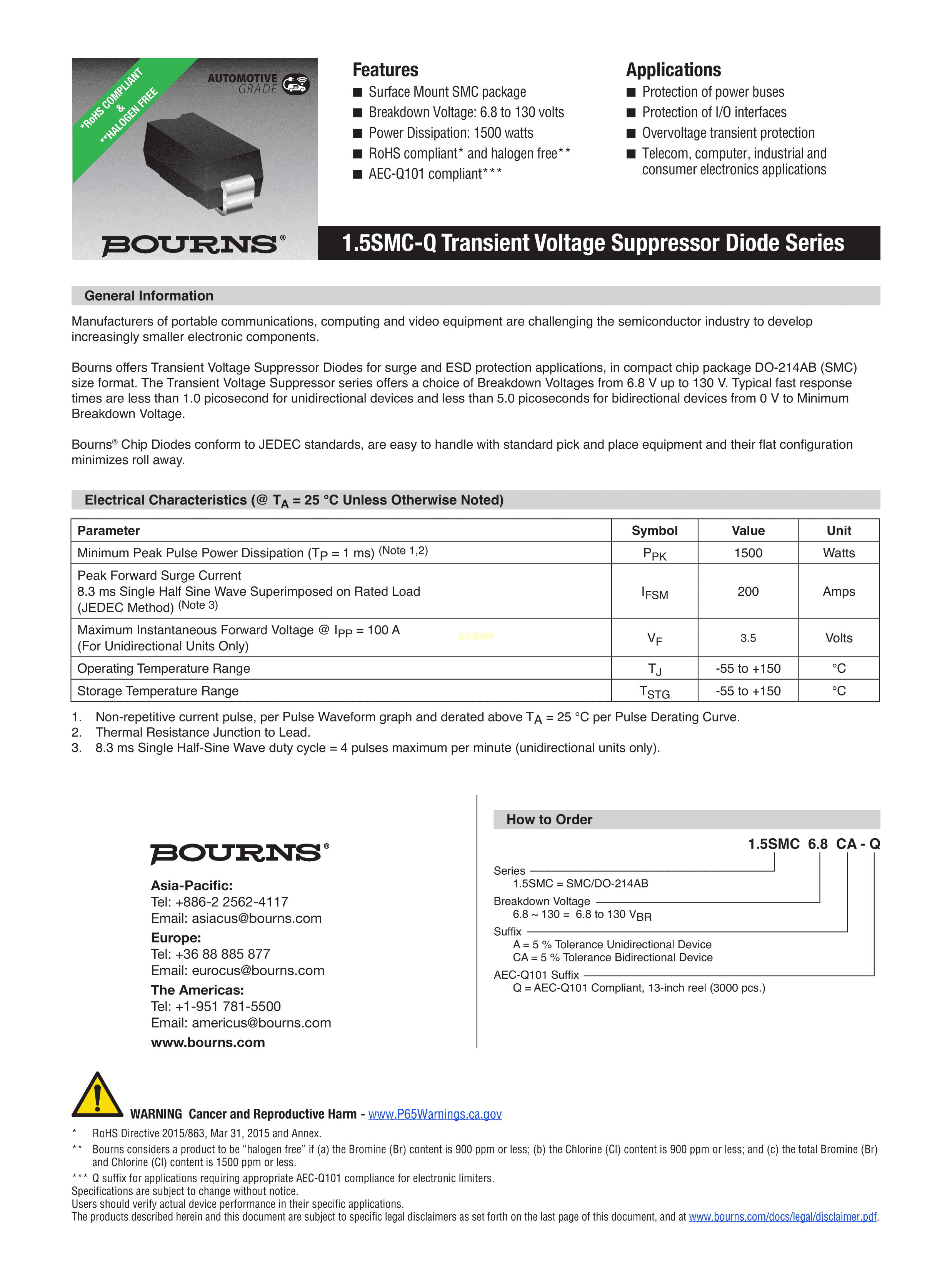 1.5SMC82CA-Q数据手册SMC(DO-214AB)封装BOURNSPDF规格书,中英文下载