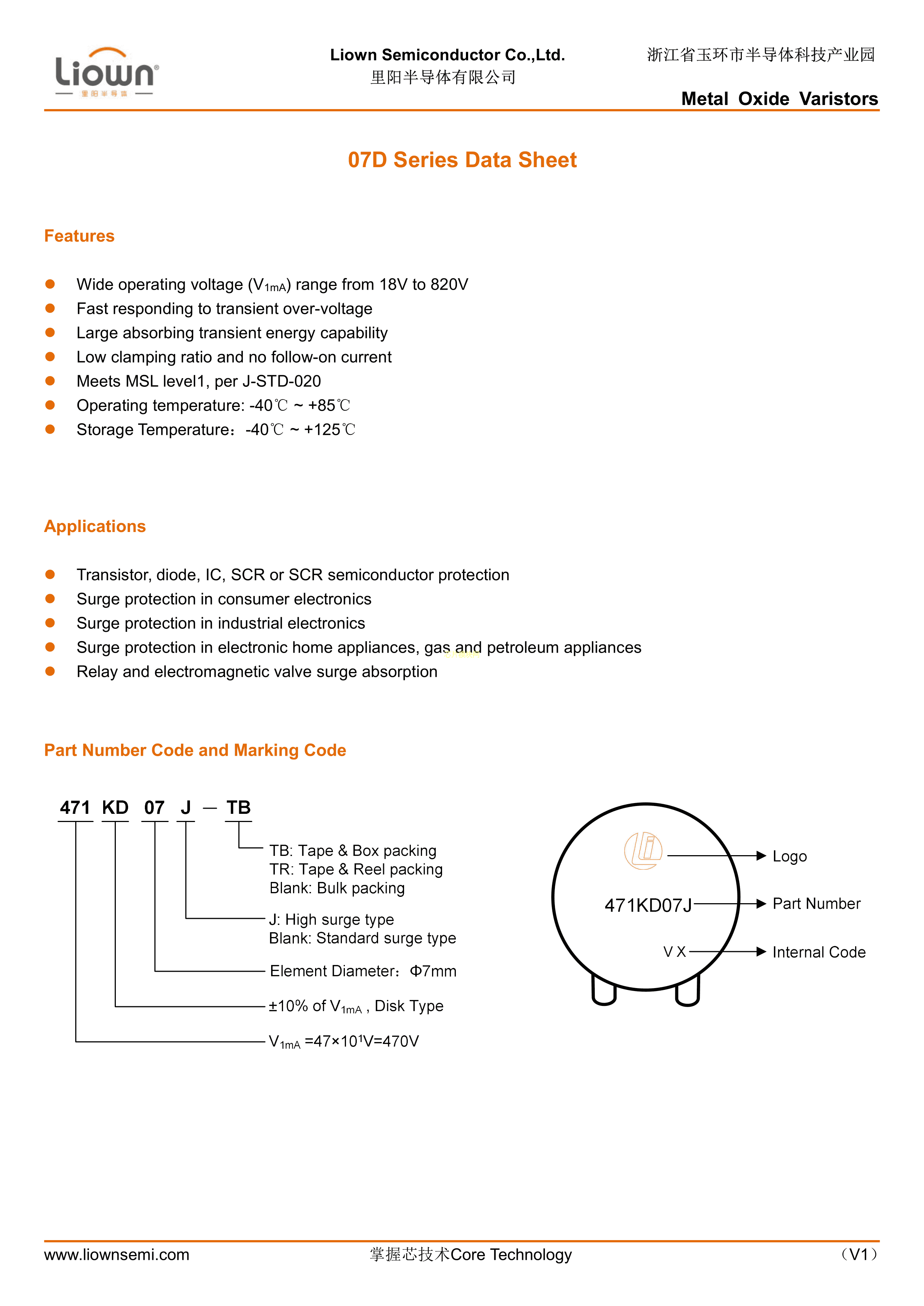 101KD07数据手册径向引线封装Liown(里阳半导体)PDF规格书,中英文下载