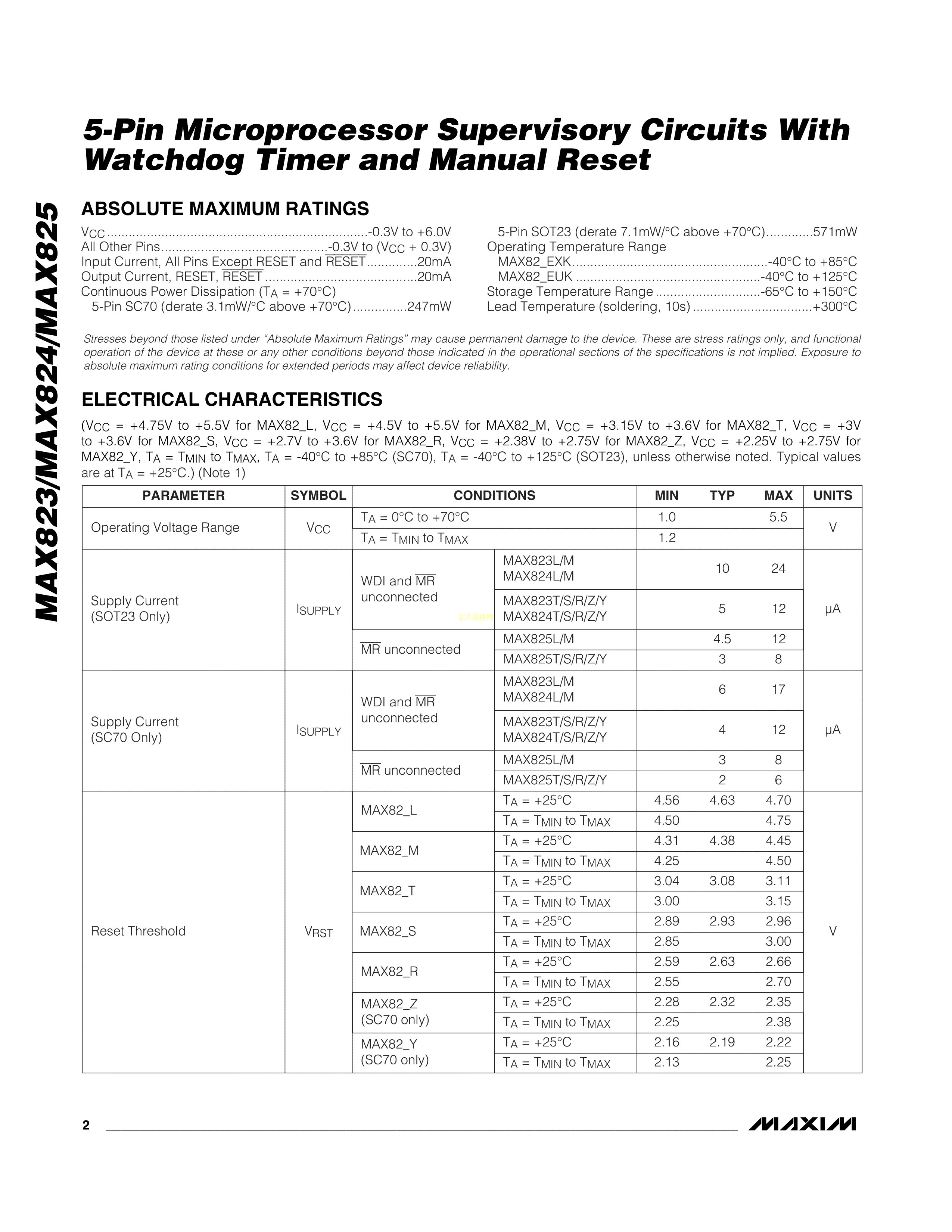 MAX823SEUK+T数据手册SOT-23-5L封装MAXIM(美信)PDF规格书,中英文下载