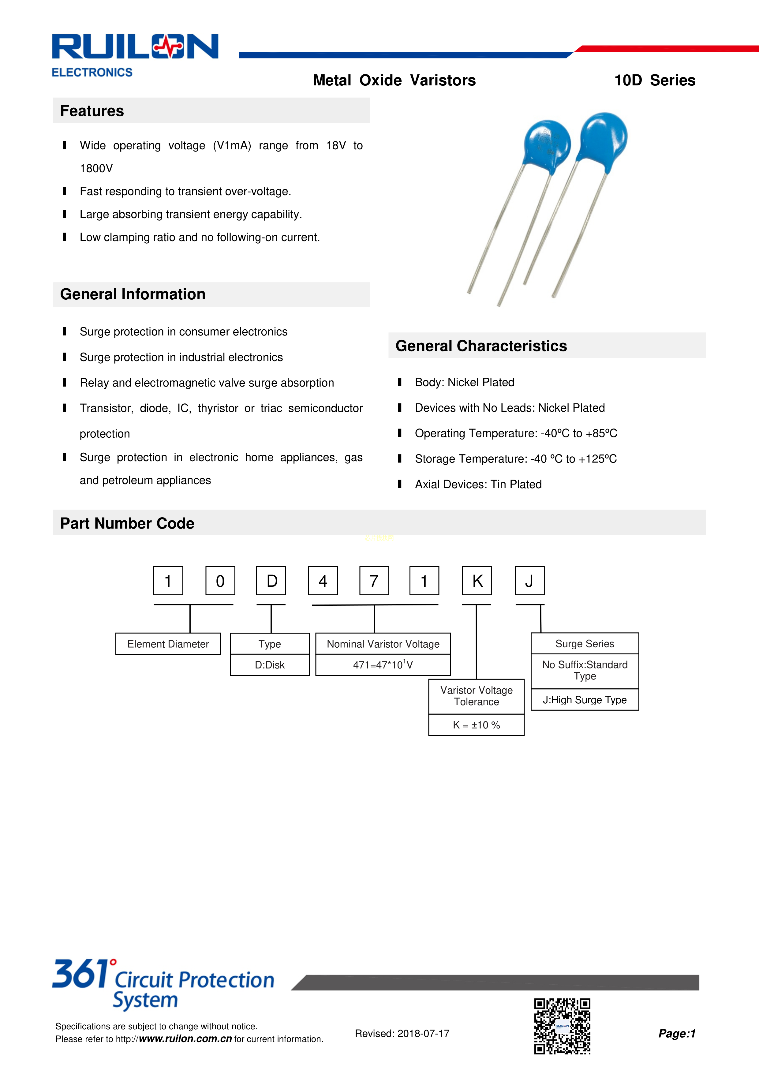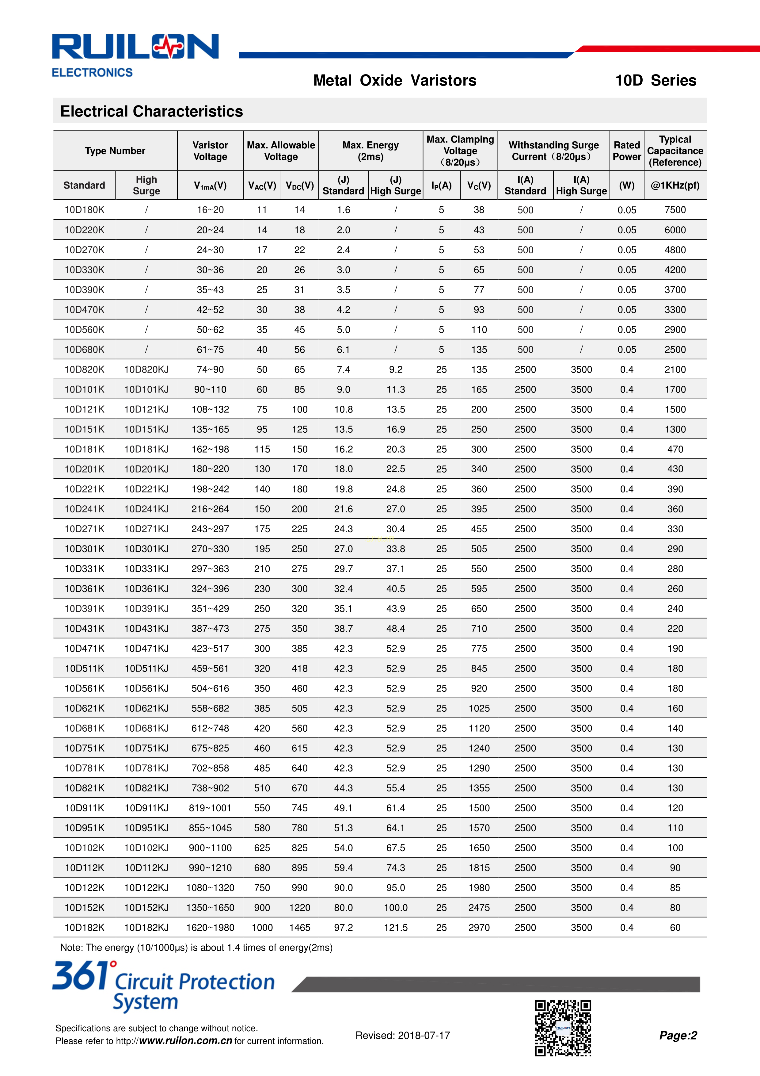 10D270K数据手册径向引线封装RUILON(瑞隆源)PDF规格书,中英文下载