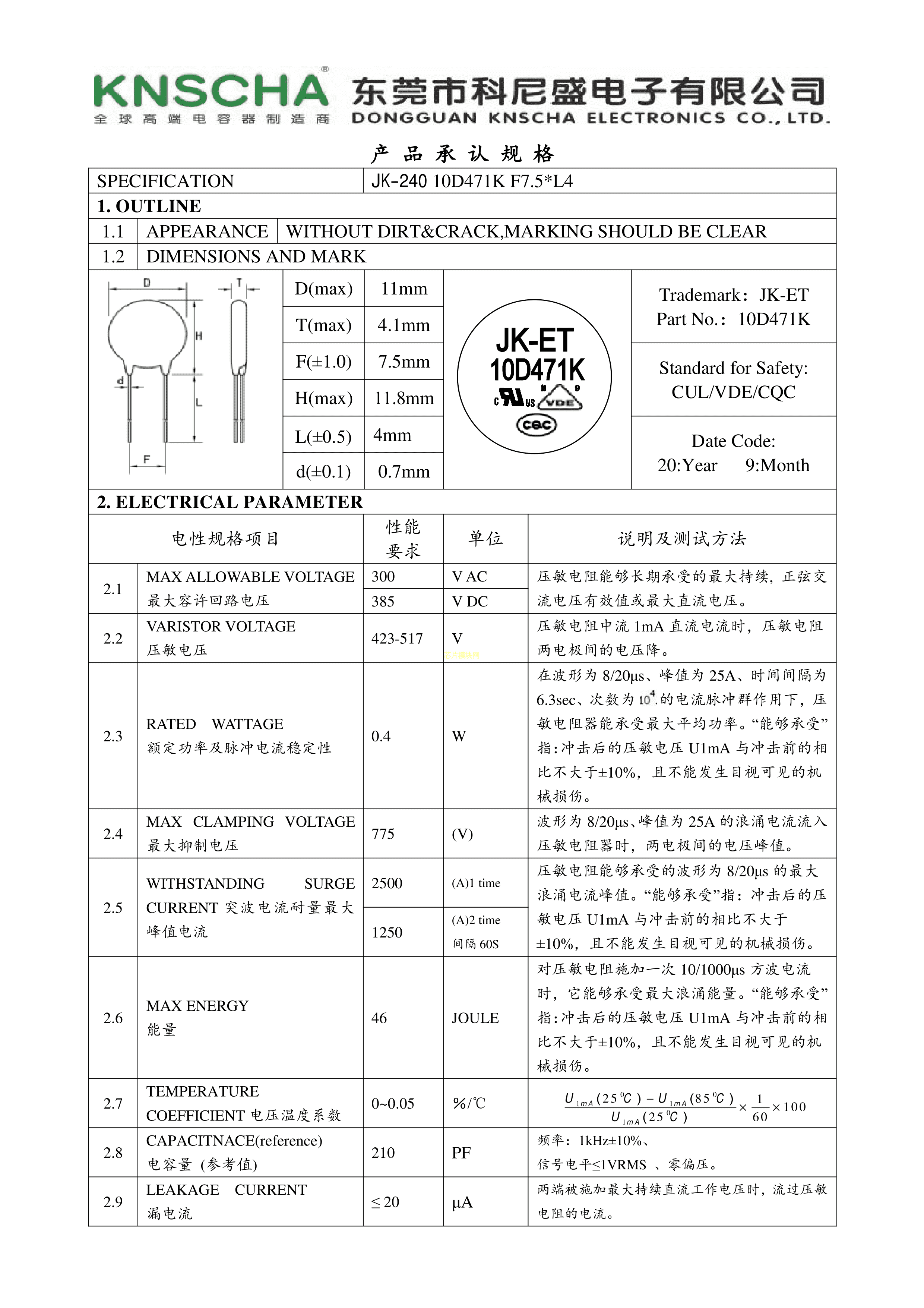 10D471K68RV0121数据手册径向引线P7.5mm封装KNSCHA(科尼盛)PDF规格书,中英文下载