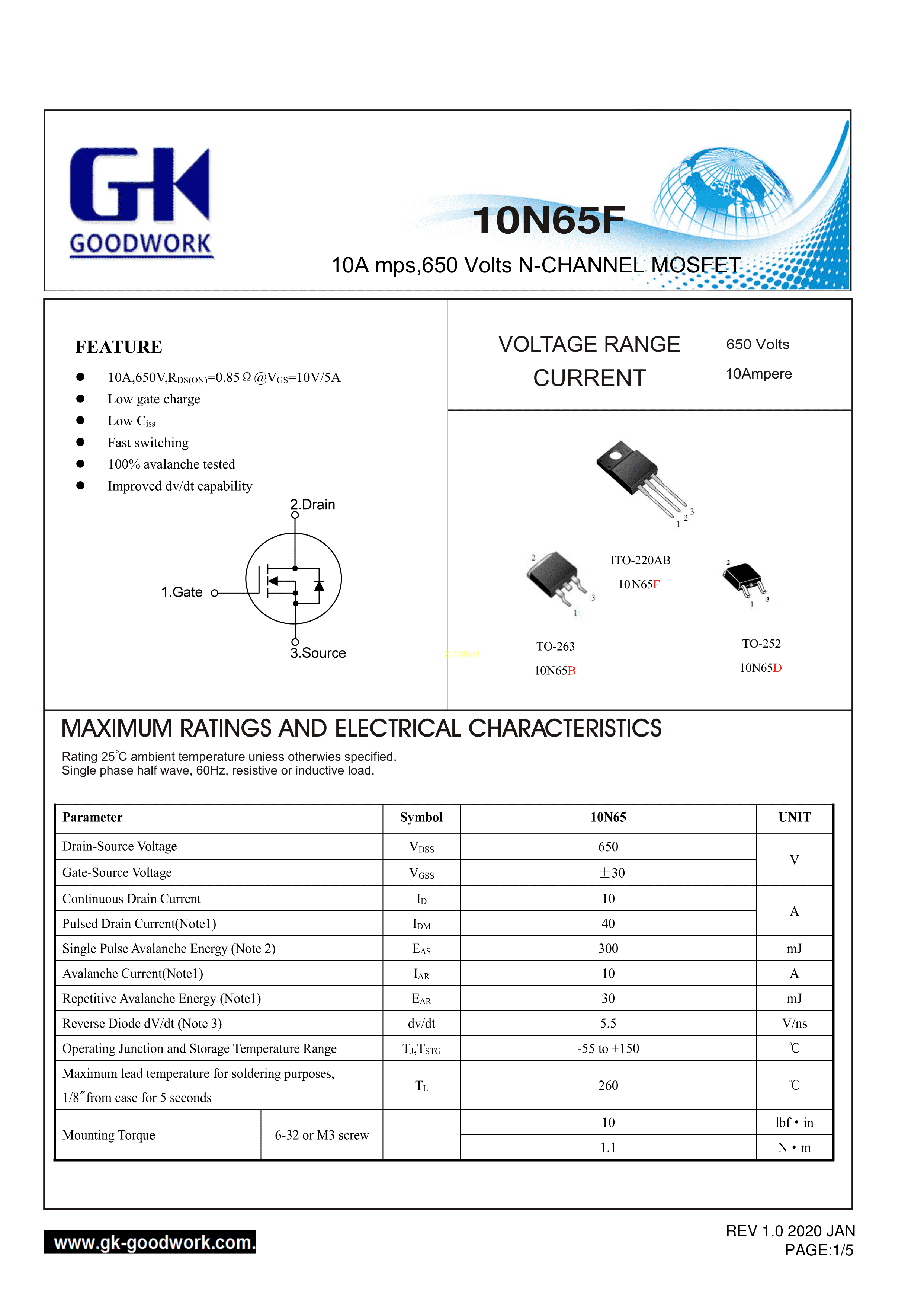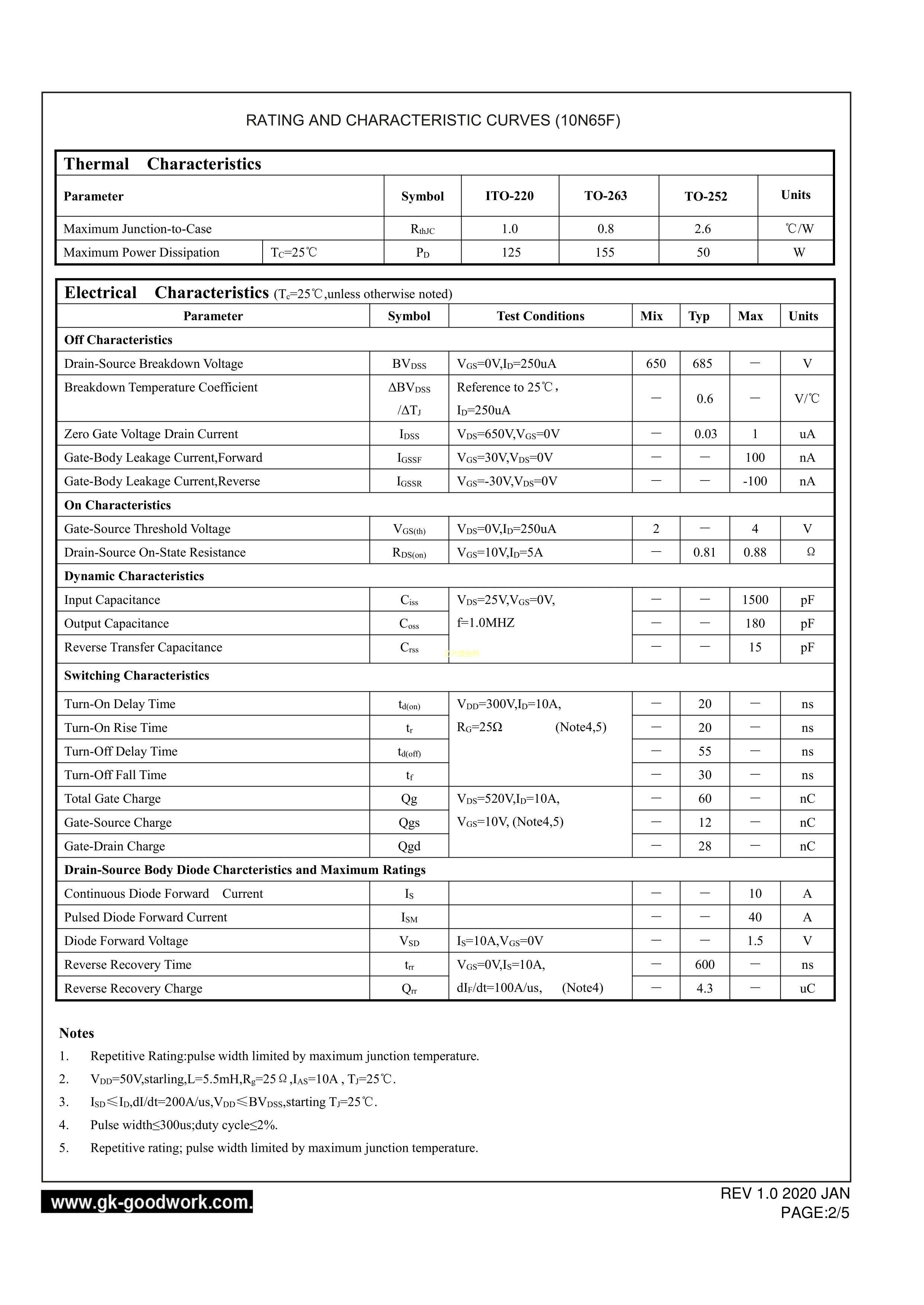 10N65F数据手册ITO-220AB封装GOODWORK(固得沃克)PDF规格书,中英文下载