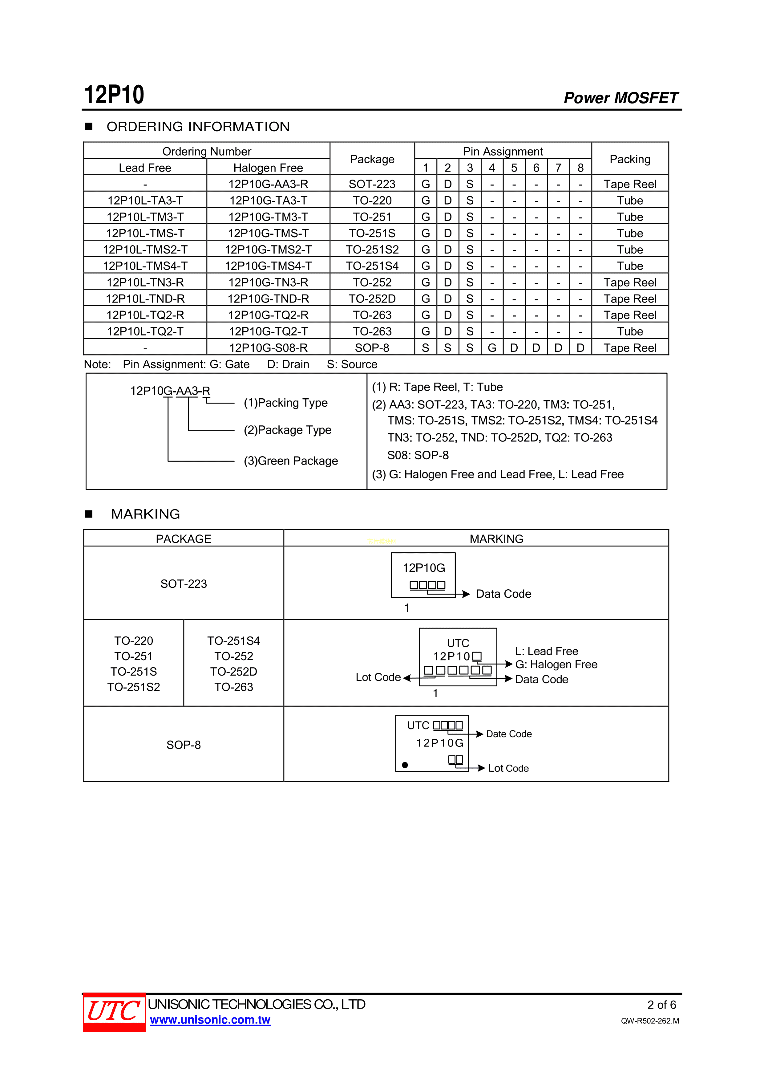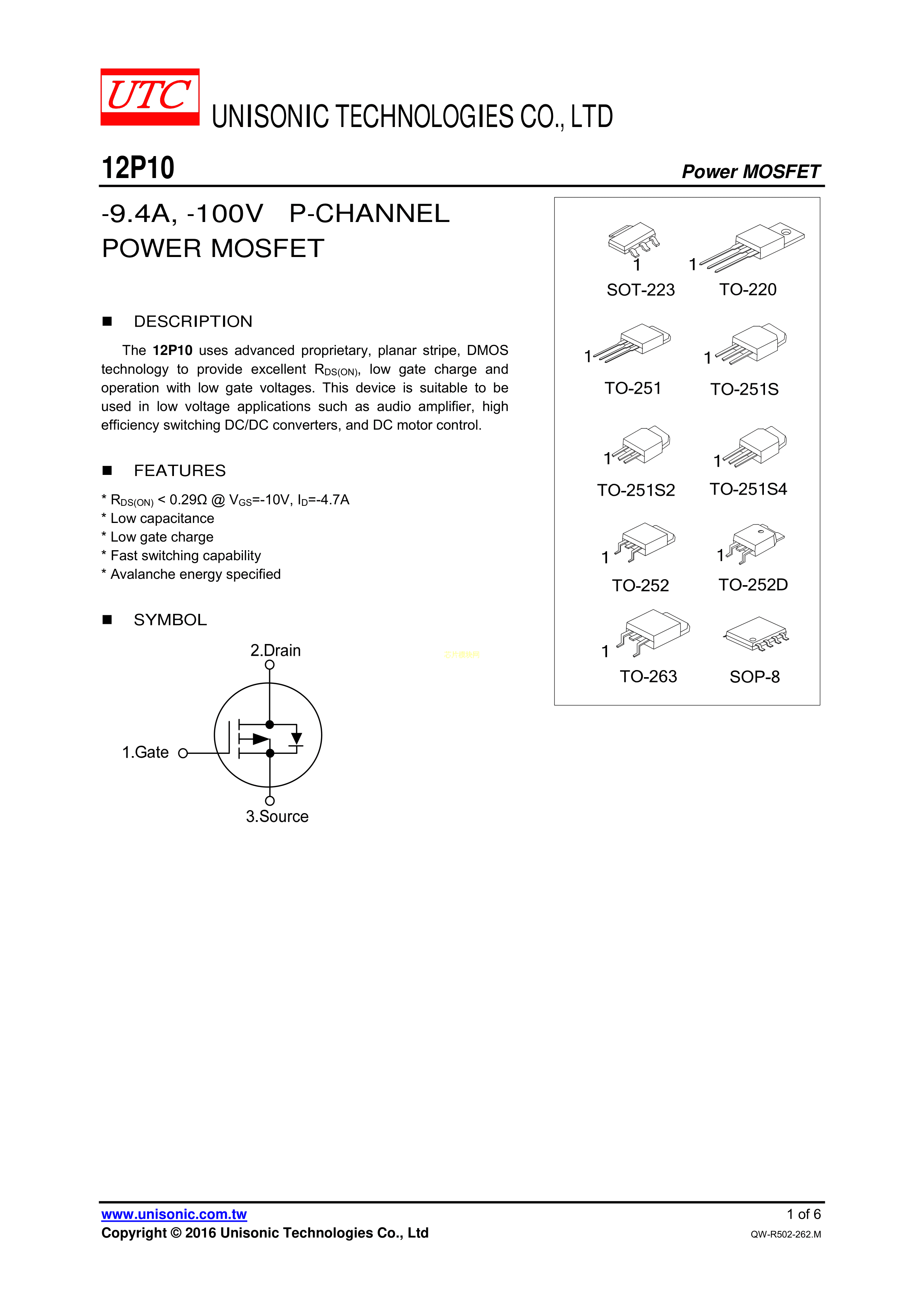 12P10L-TN3-R数据手册TO-252-2(DPAK)封装UTC(友顺)PDF规格书,中英文下