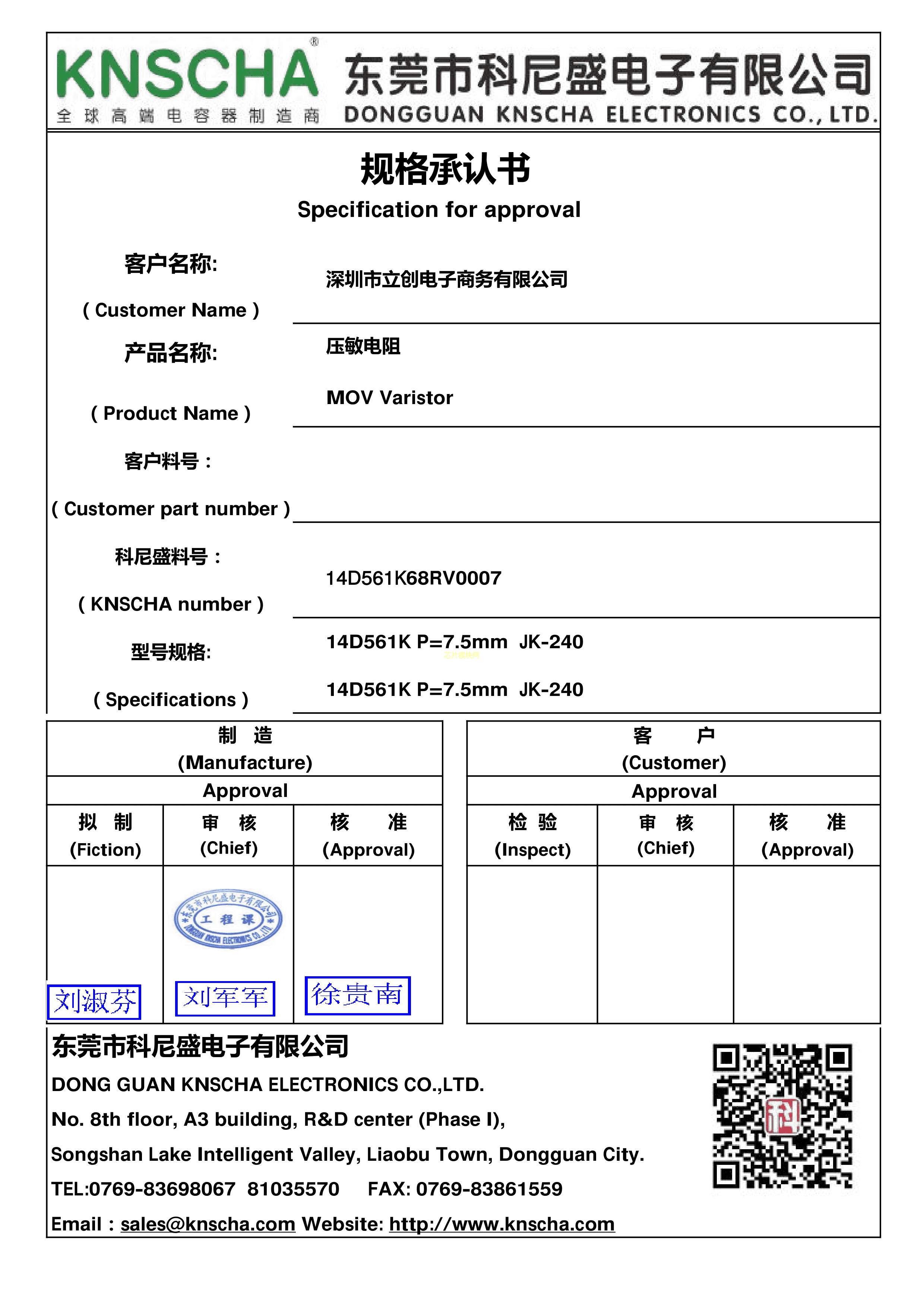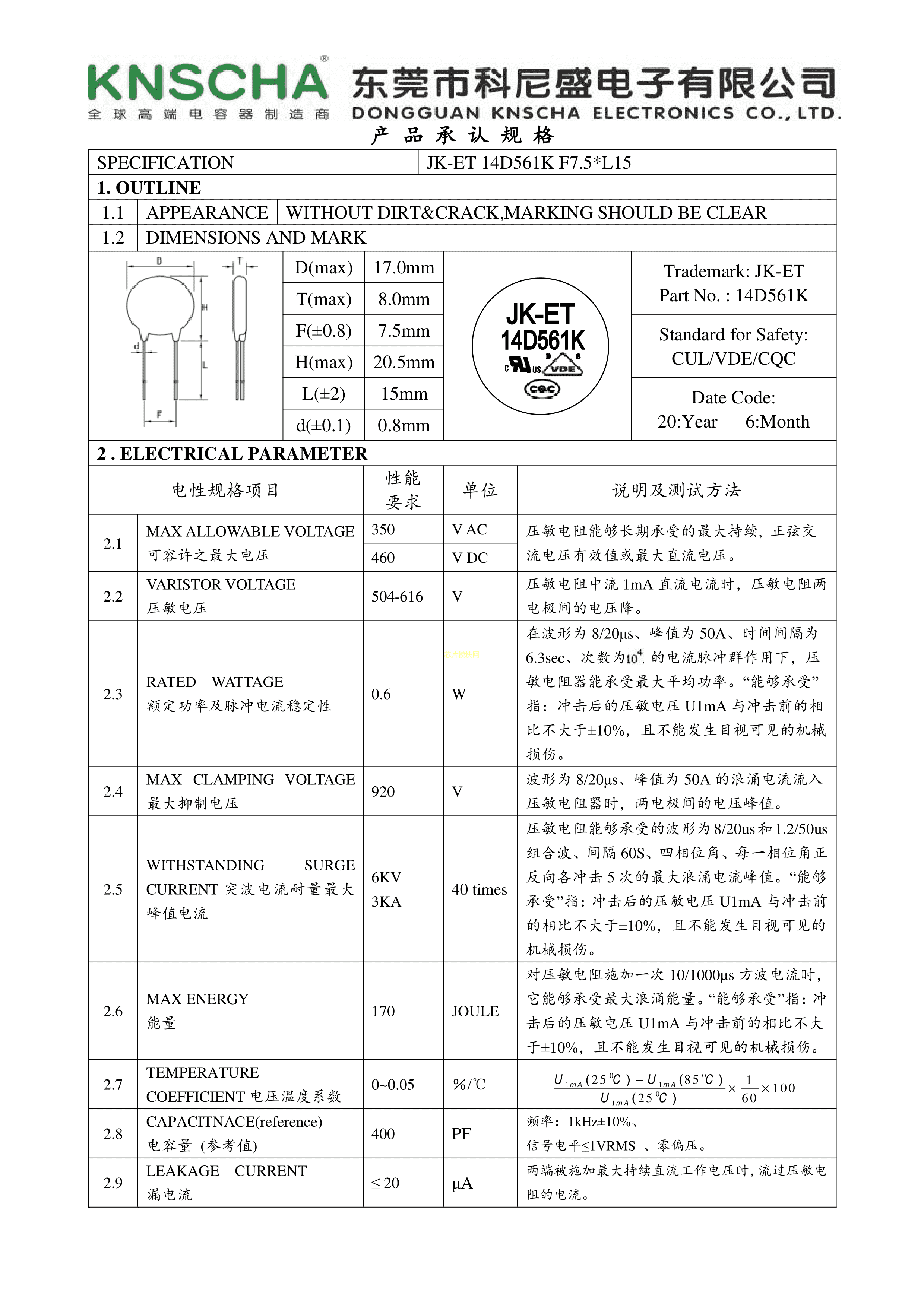 14D561K68RV0007数据手册径向引线P7.5mm封装KNSCHA(科尼盛)PDF规格书,中英文下载
