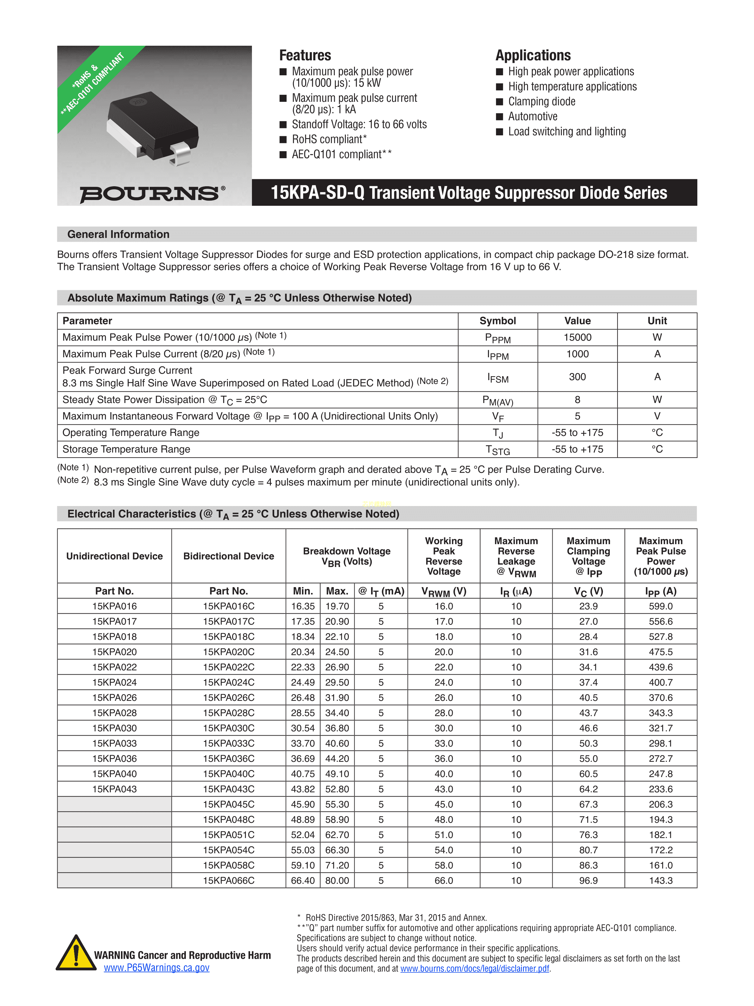 15KPA054C-SD-Q数据手册DO-218封装BOURNSPDF规格书,中英文下载