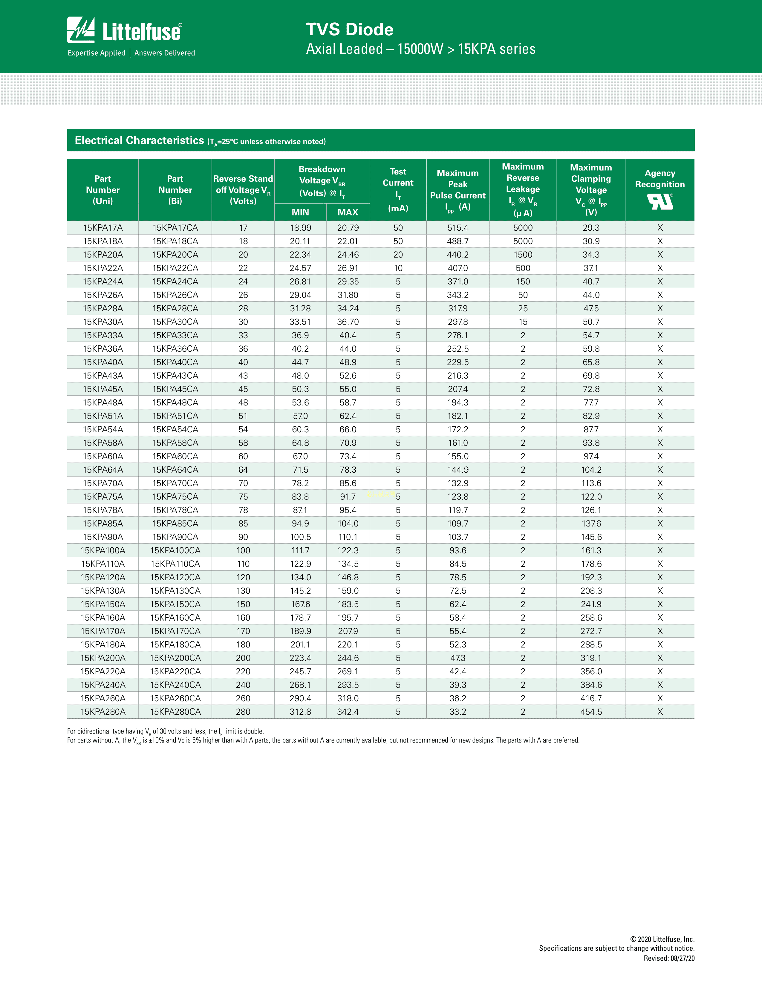 15KPA240A-B数据手册Axial封装Littelfuse(美国力特)PDF规格书,中英文下载