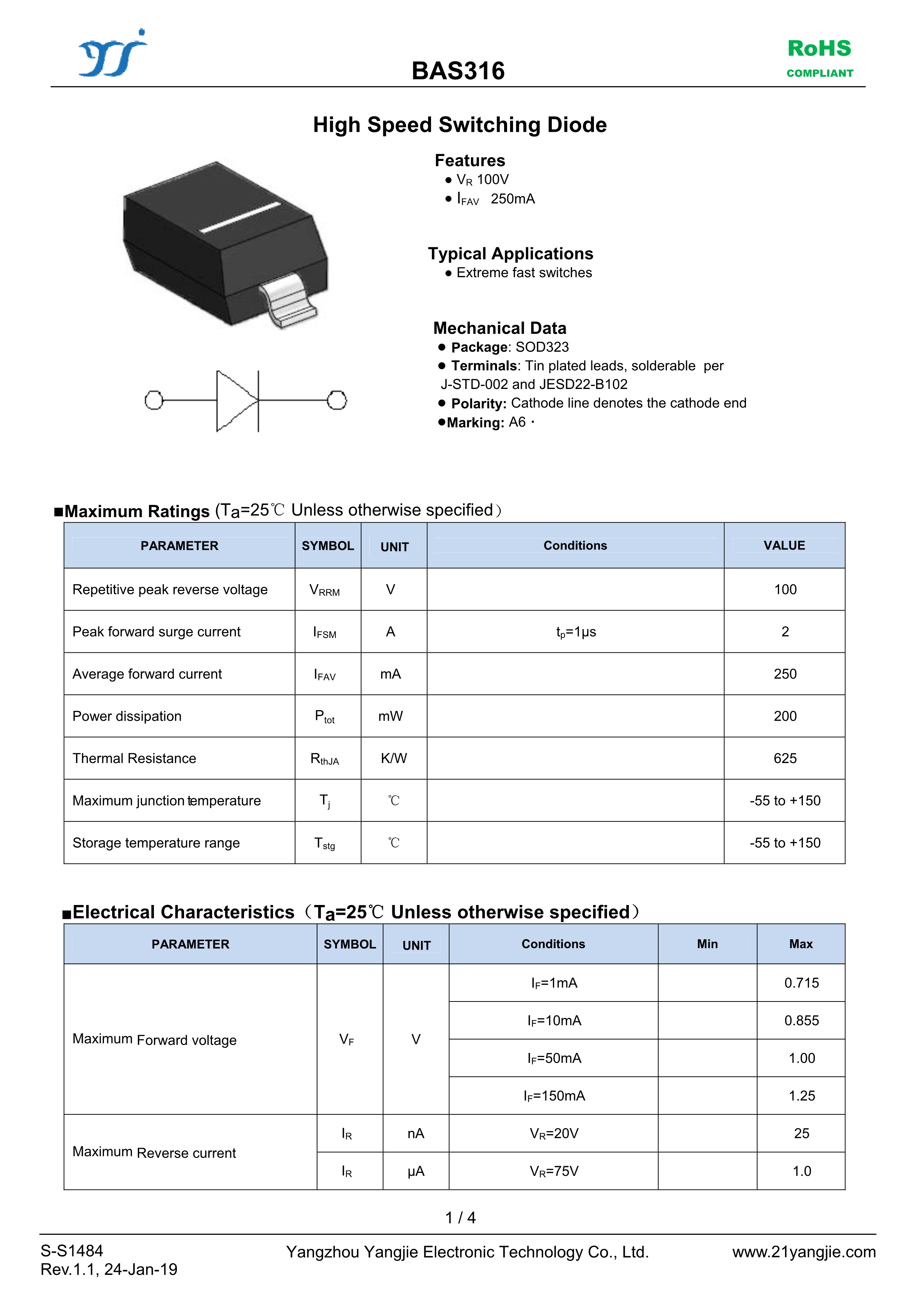 BAS316数据手册SOD-323封装YANGJIE(扬杰)PDF规格书,中英文下载