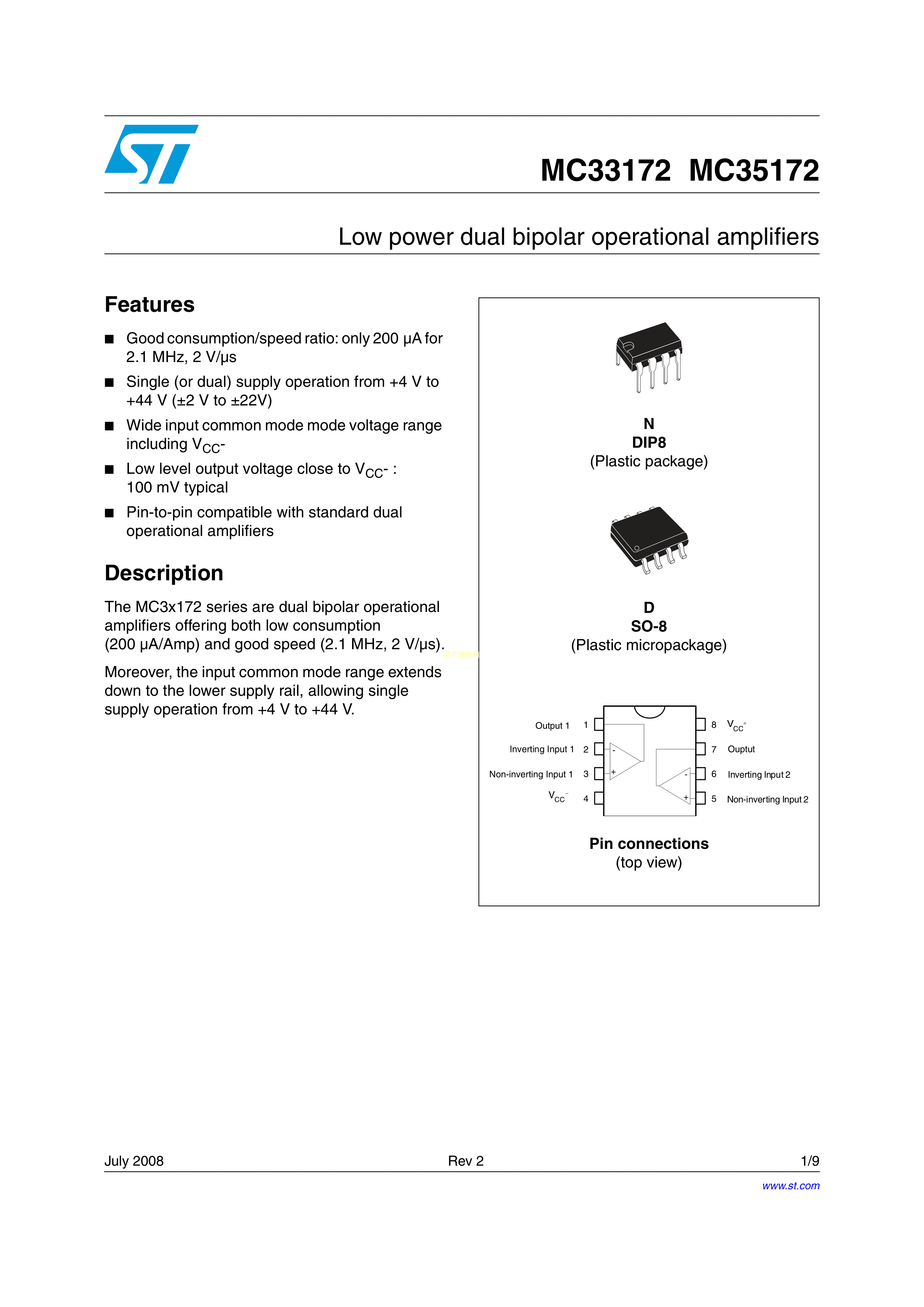 MC33172D数据手册SO-8封装ST(意法半导体)PDF规格书,中英文下载