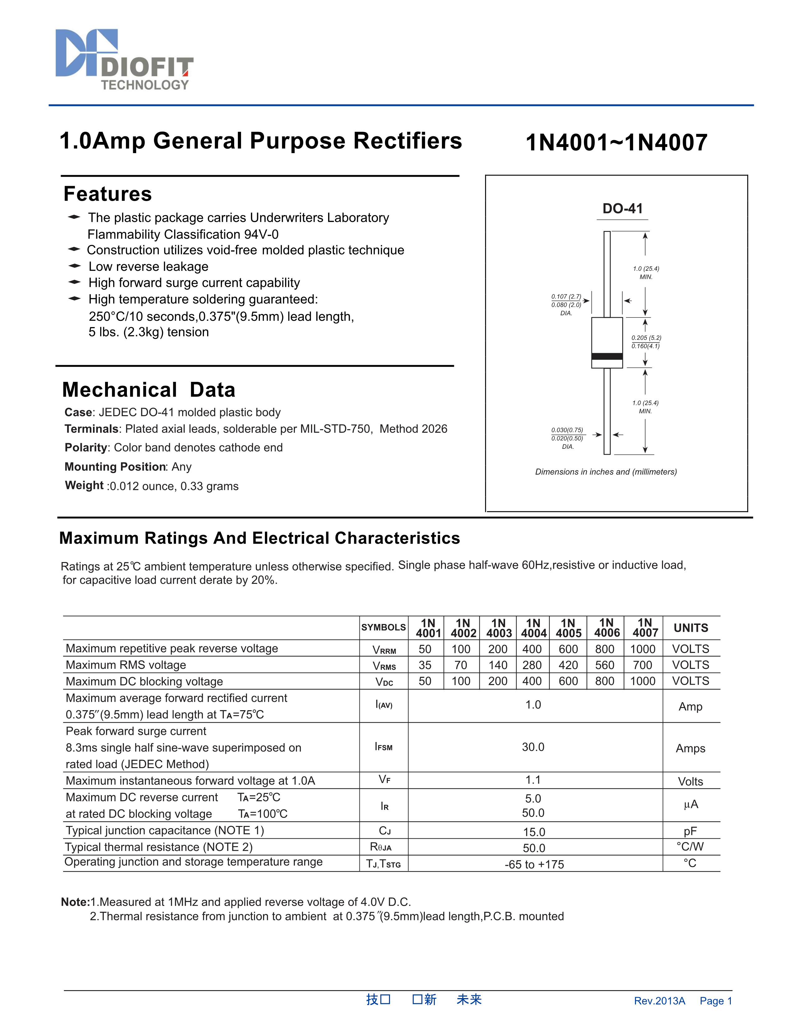 1N4007数据手册DO-41封装DIOFIT(對餘科技)PDF规格书,中英文下载