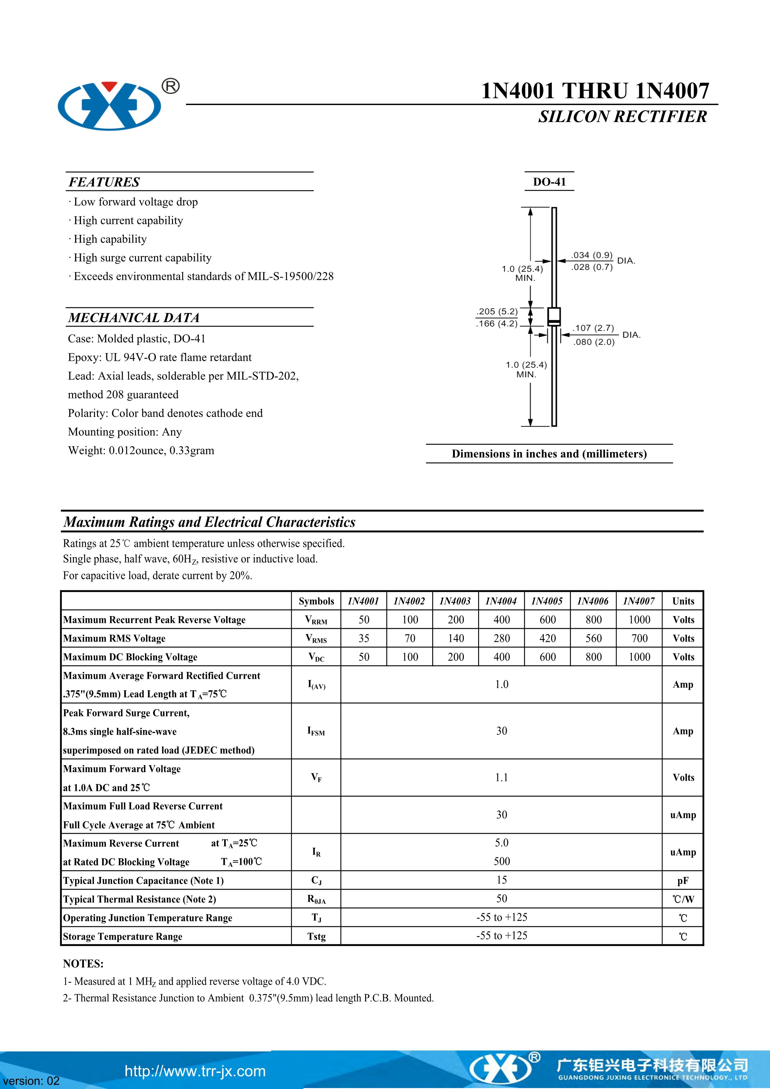 1N4007数据手册DO-41封装JUXING(钜兴)PDF规格书,中英文下载