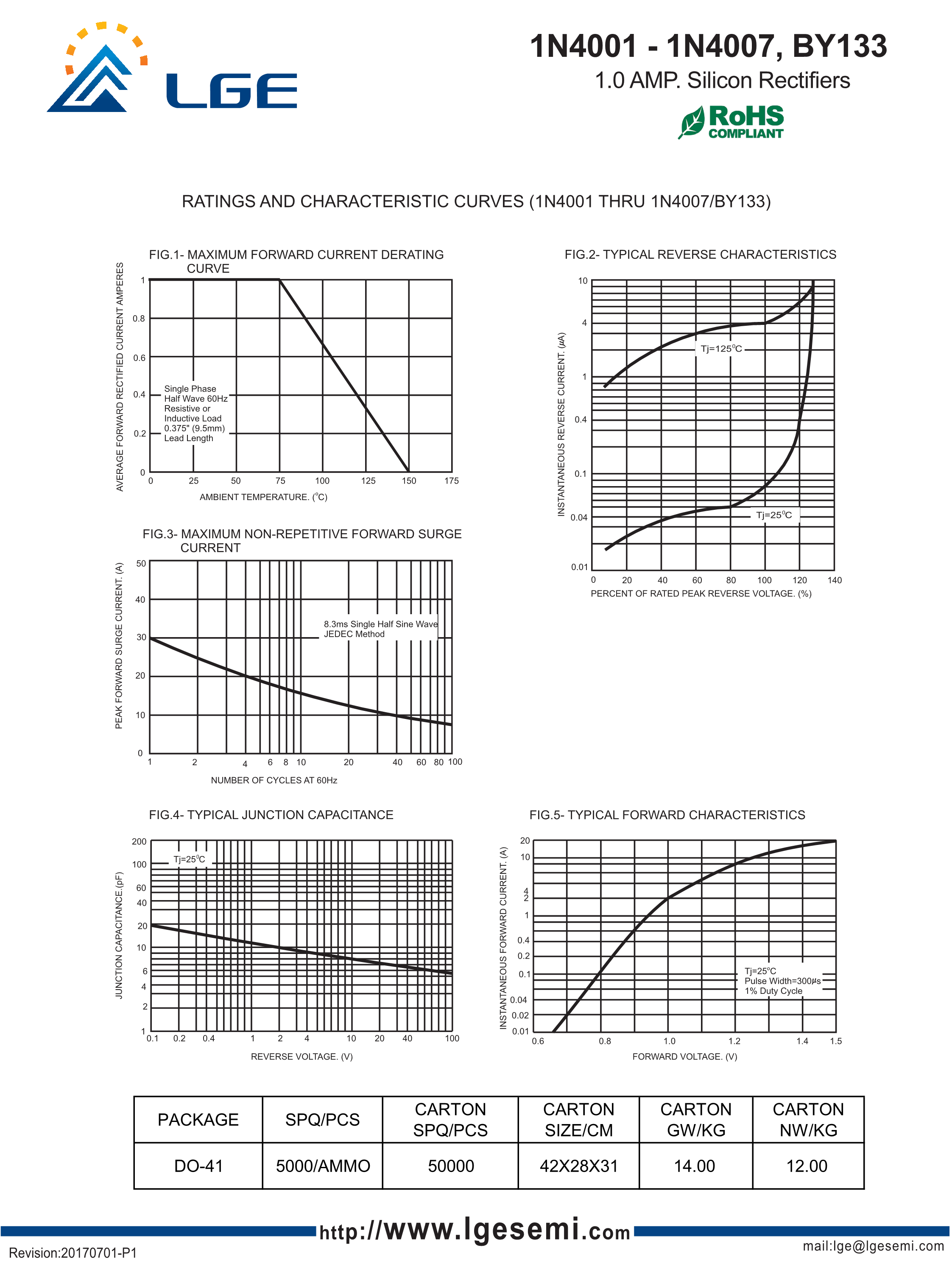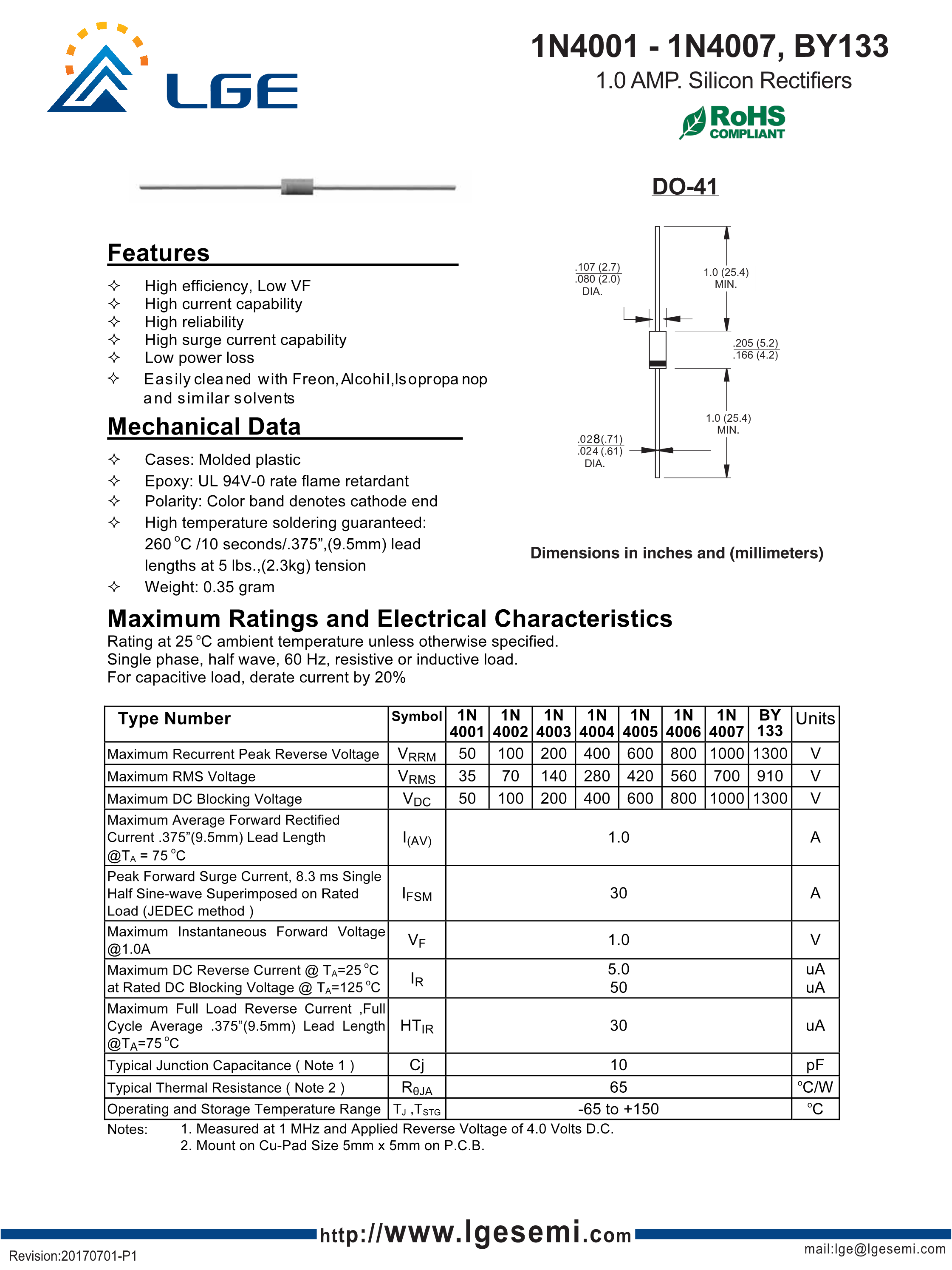 1N4007数据手册DO-41封装LGE(鲁光)PDF规格书,中英文下载
