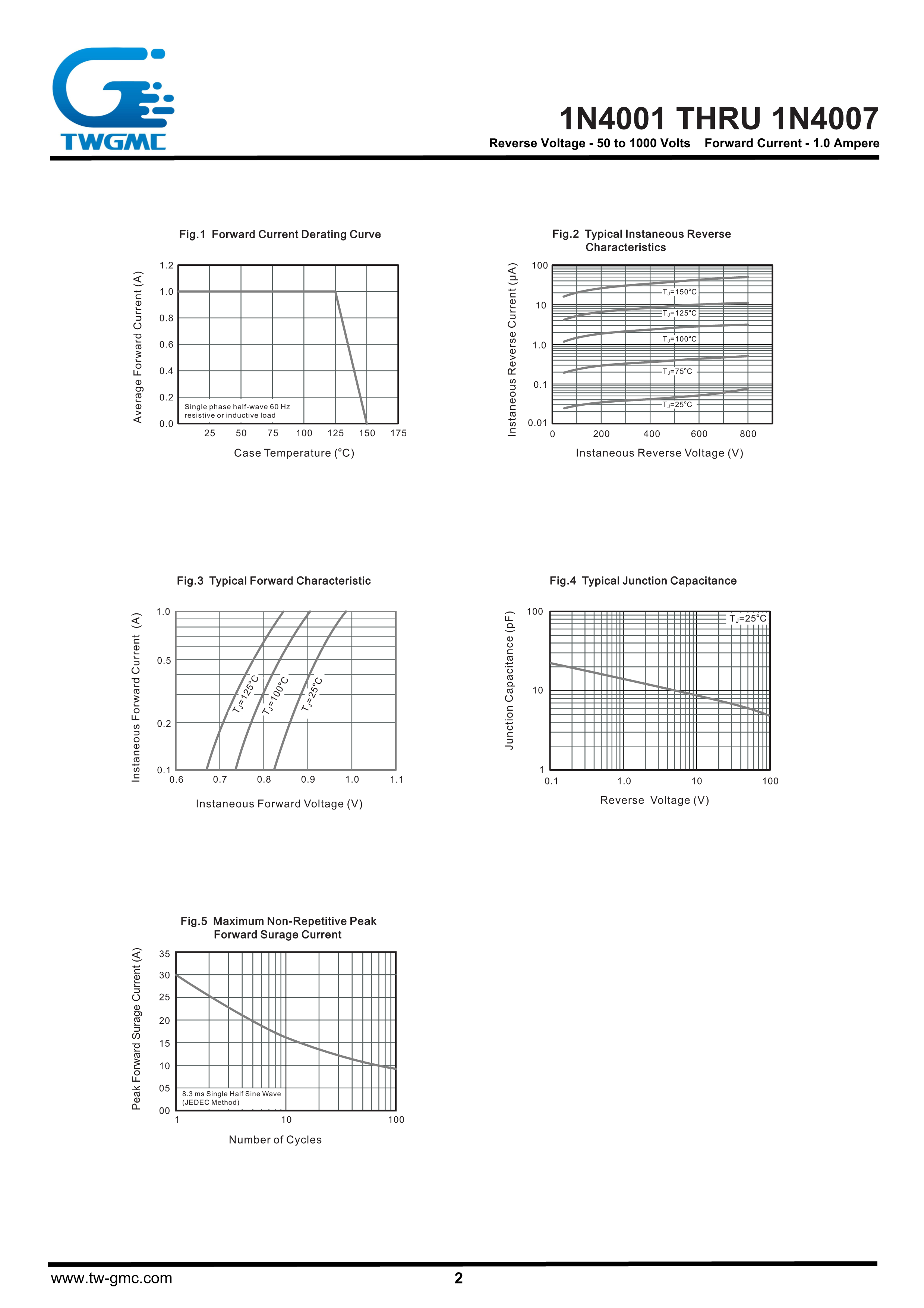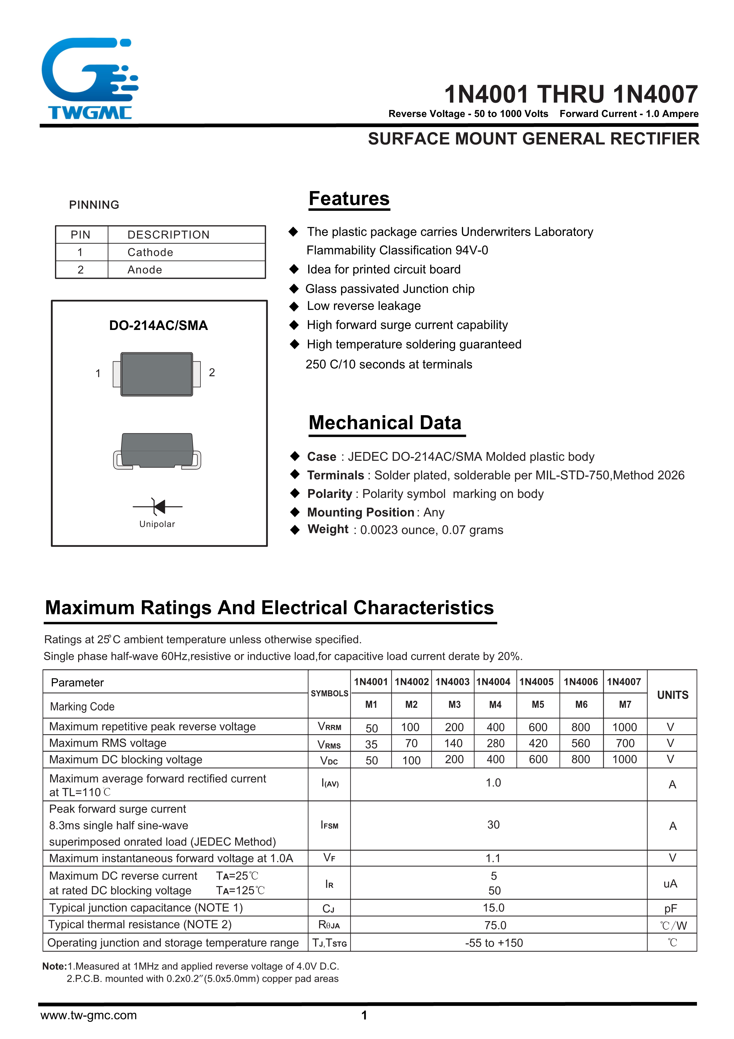 1N4007数据手册SMA(DO-214AC)封装TWGMC(台湾迪嘉)PDF规格书,中英文下载
