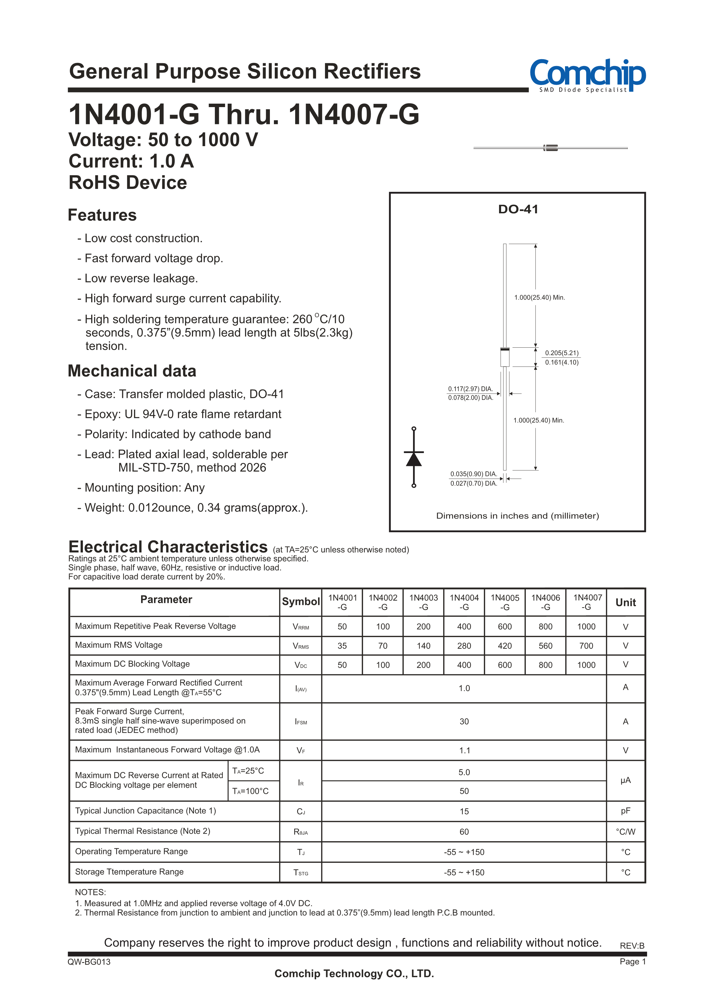1N4007-G数据手册DO-41封装Comchip Technology(典琦)PDF规格书,中英
