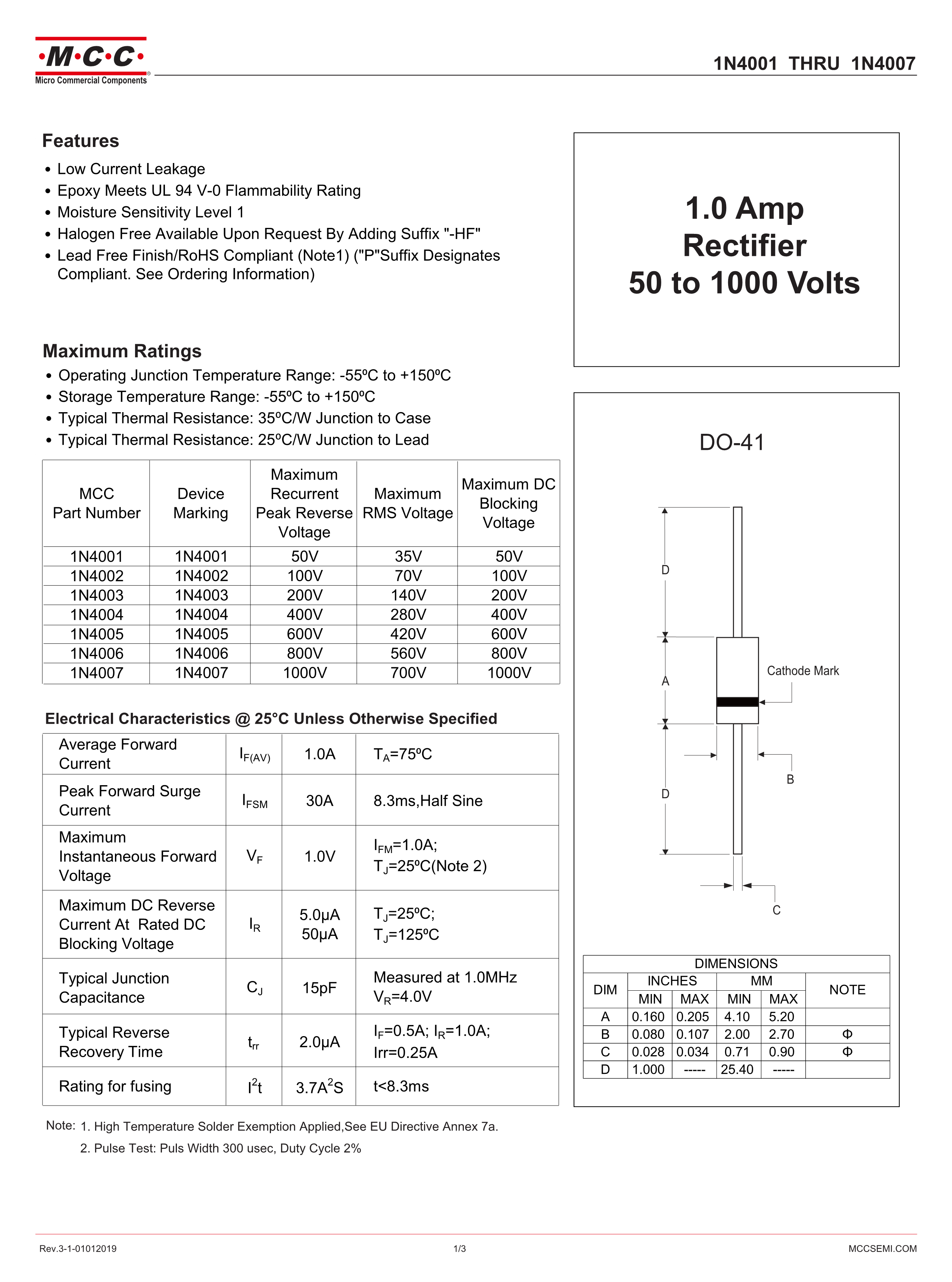 1N4007-TP数据手册DO-41封装MCC(美微科)PDF规格书,中英文下载