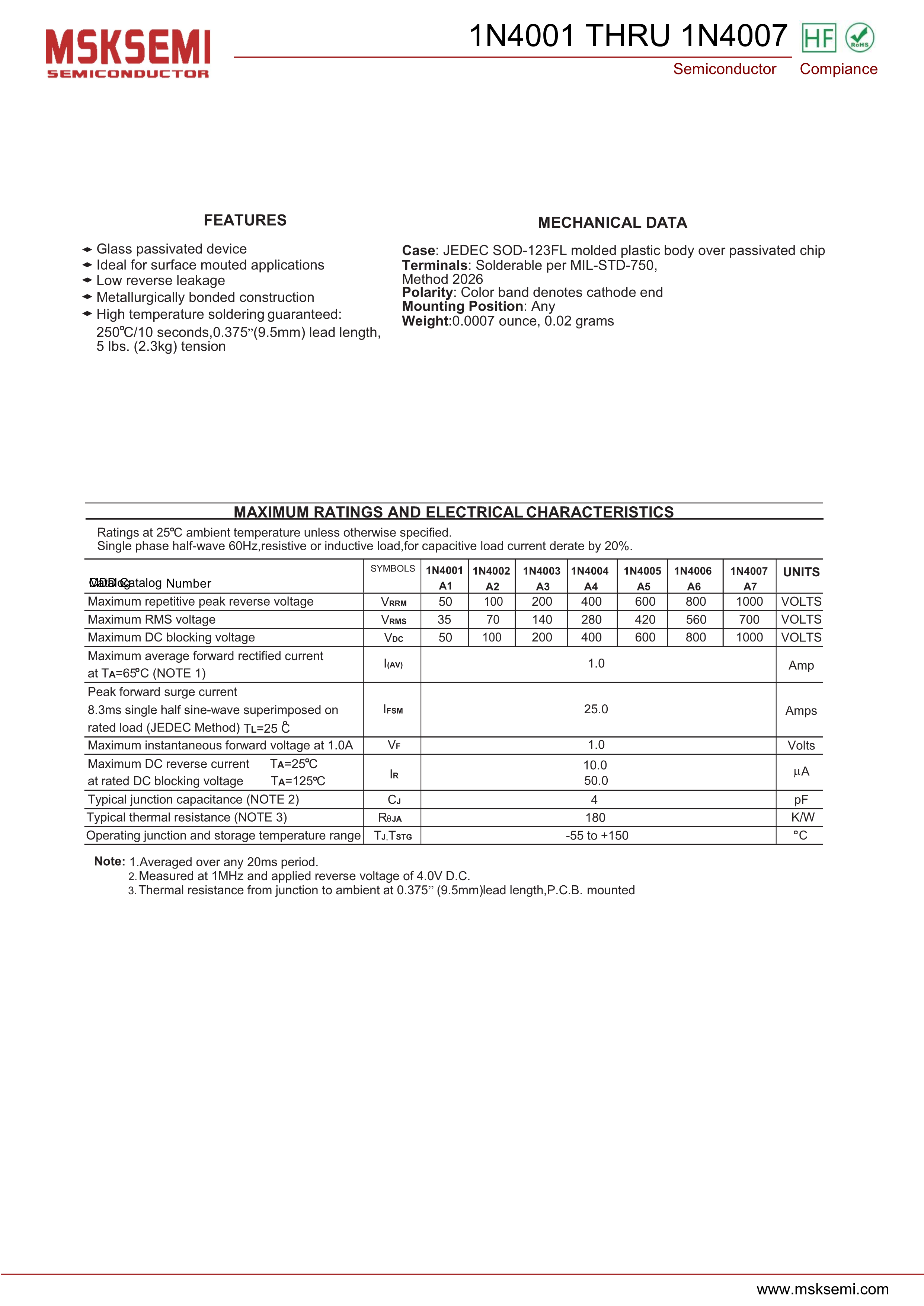 1N4007 A7数据手册SOD-123FL封装MSKSEMI(美森科)PDF规格书,中英文下载