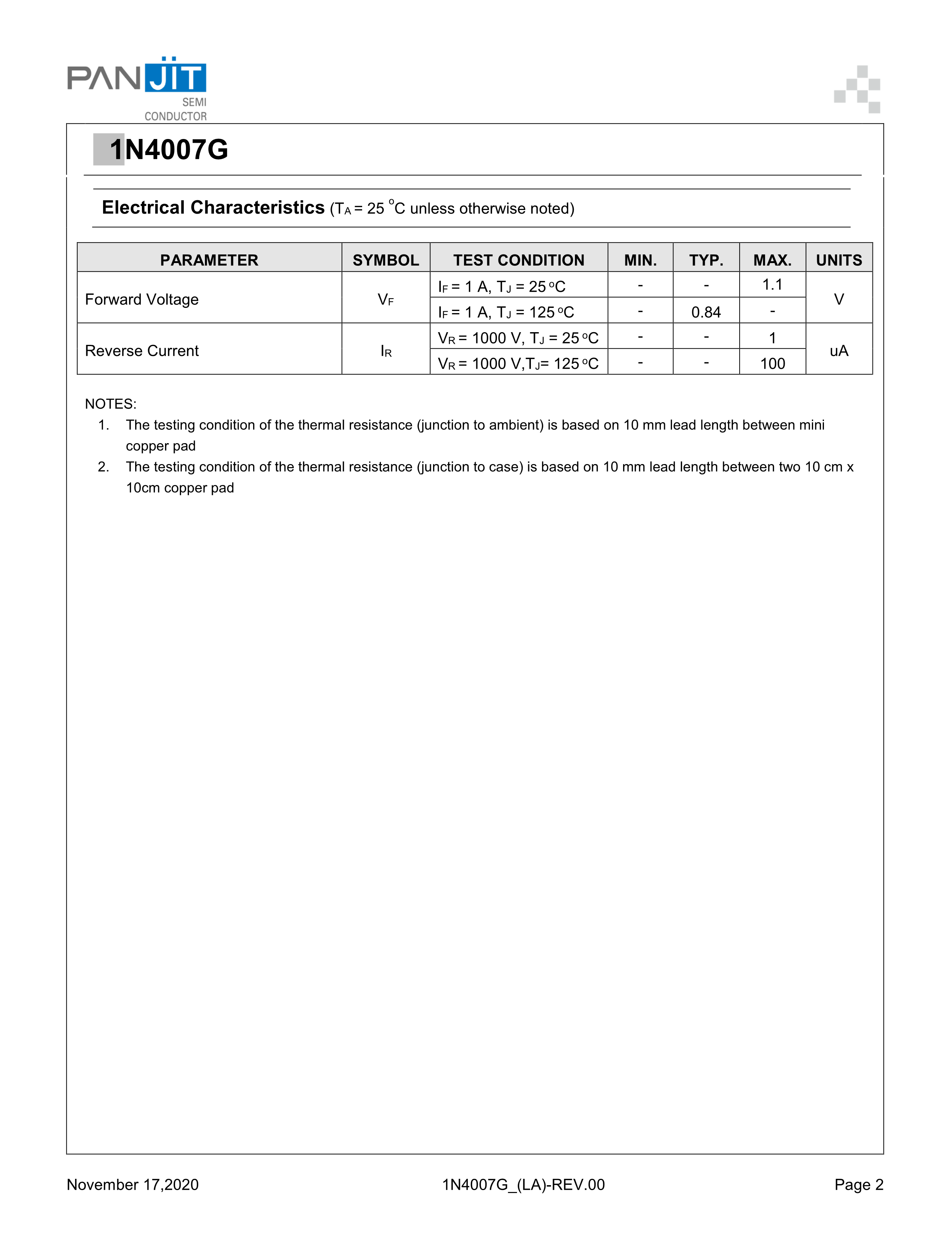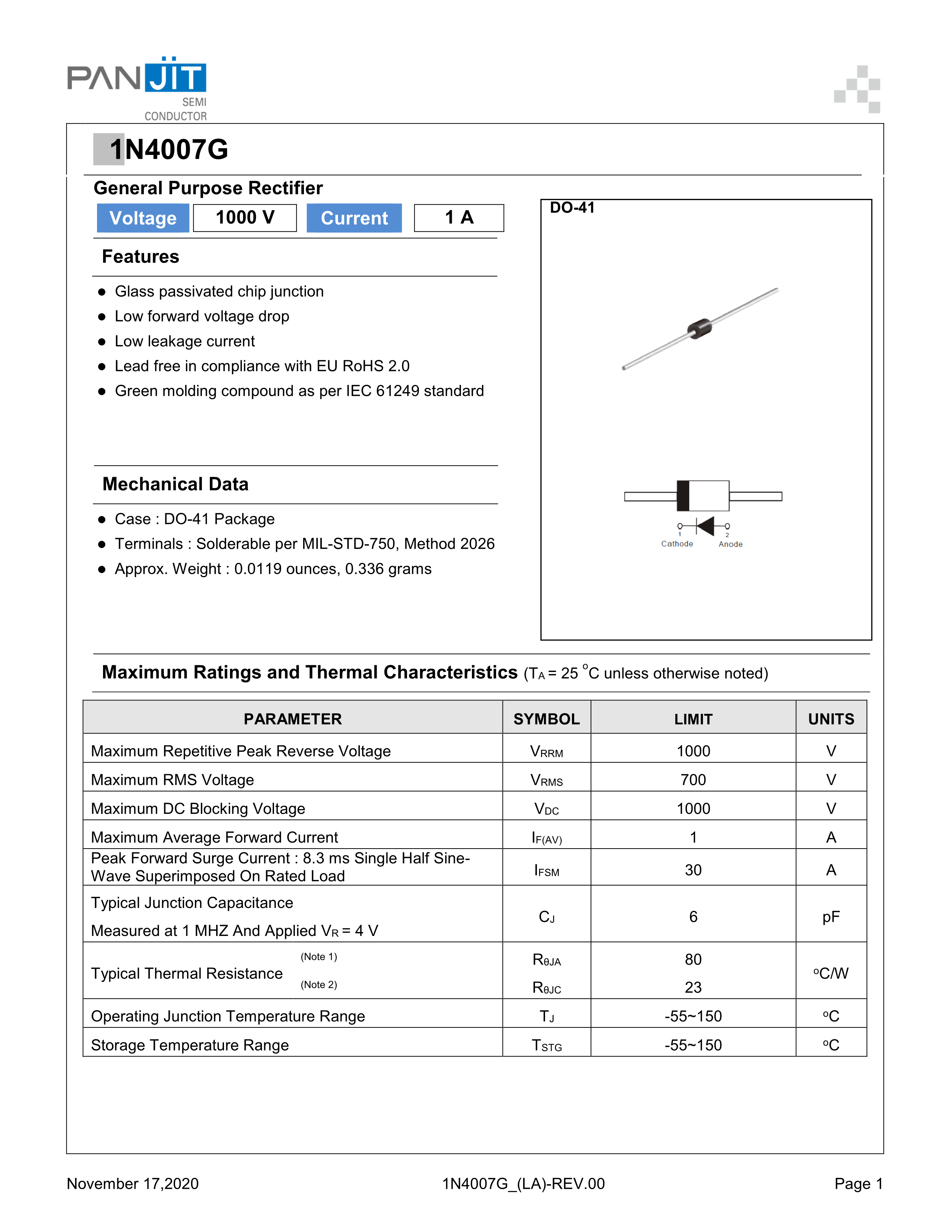 1N4007G数据手册DO-41封装PANJIT(强茂)PDF规格书,中英文下载
