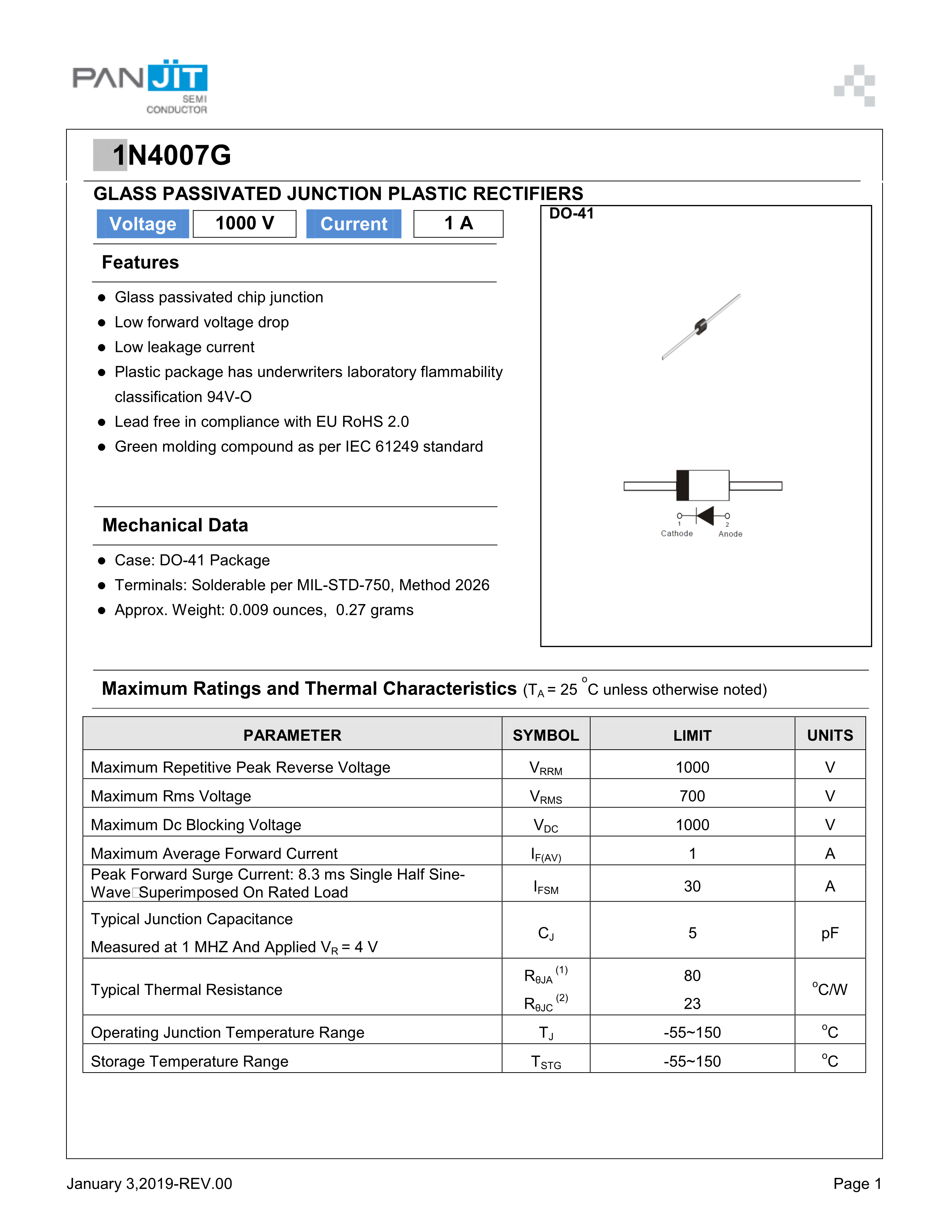 1N4007G_AY_00101数据手册DO-41封装PANJIT(强茂)PDF规格书,中英文下载