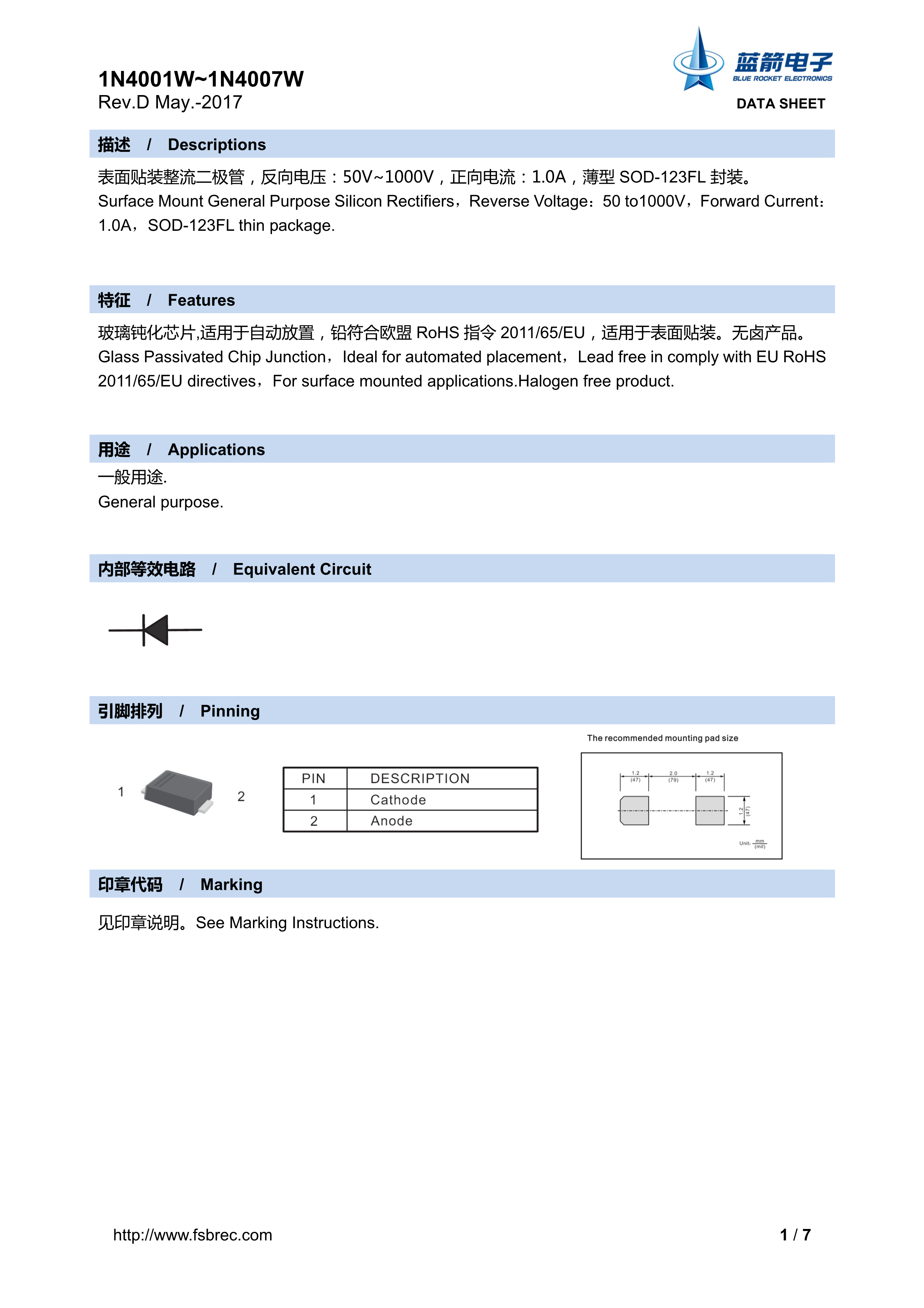 1N4007W数据手册SOD-123FL封装BLUE ROCKET(蓝箭)PDF规格书,中英文下载
