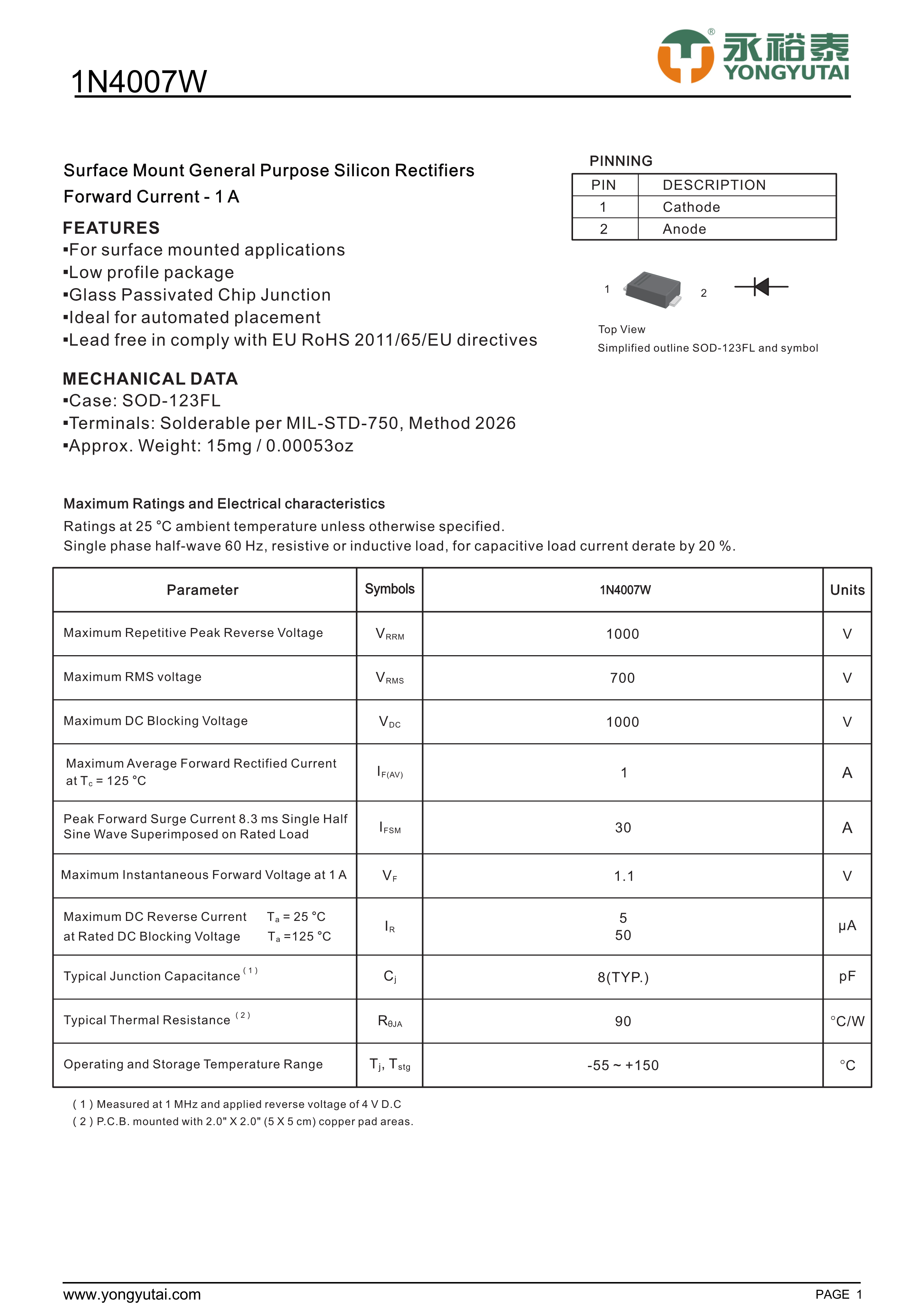 1N4007W 42MIL数据手册SOD-123FL封装YONGYUTAI(永裕泰)PDF规格书,中