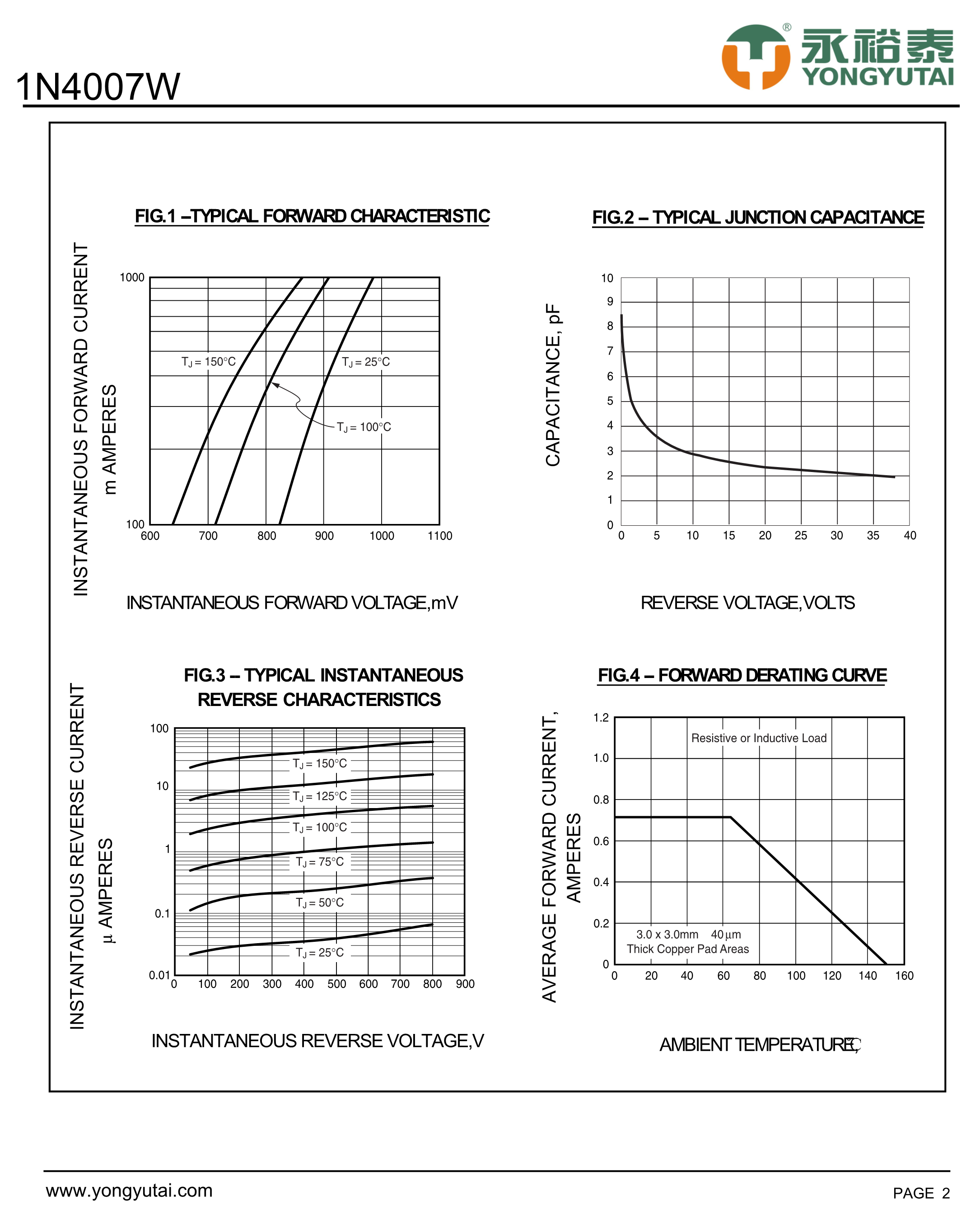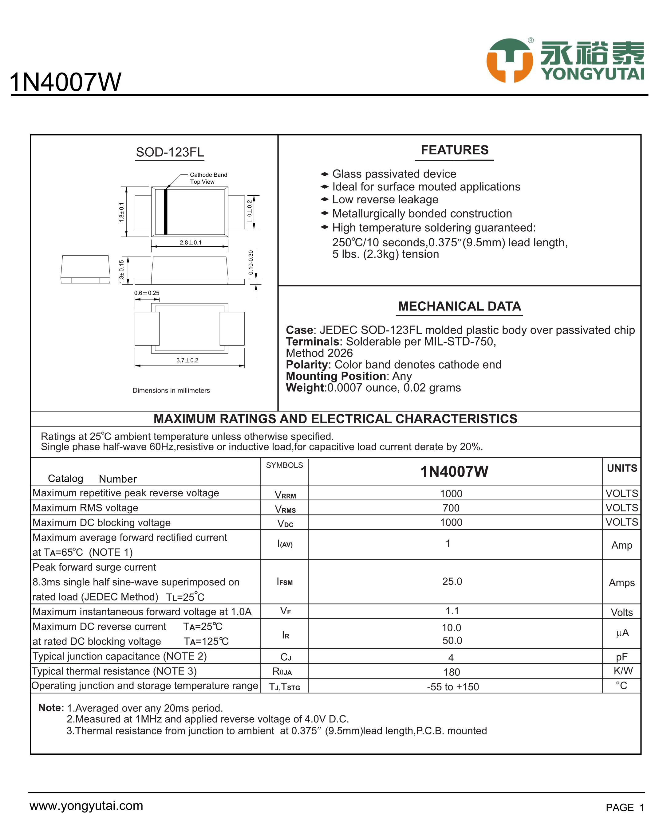 1N4007W 46MIL数据手册SOD-123FL封装YONGYUTAI(永裕泰)PDF规格书,中