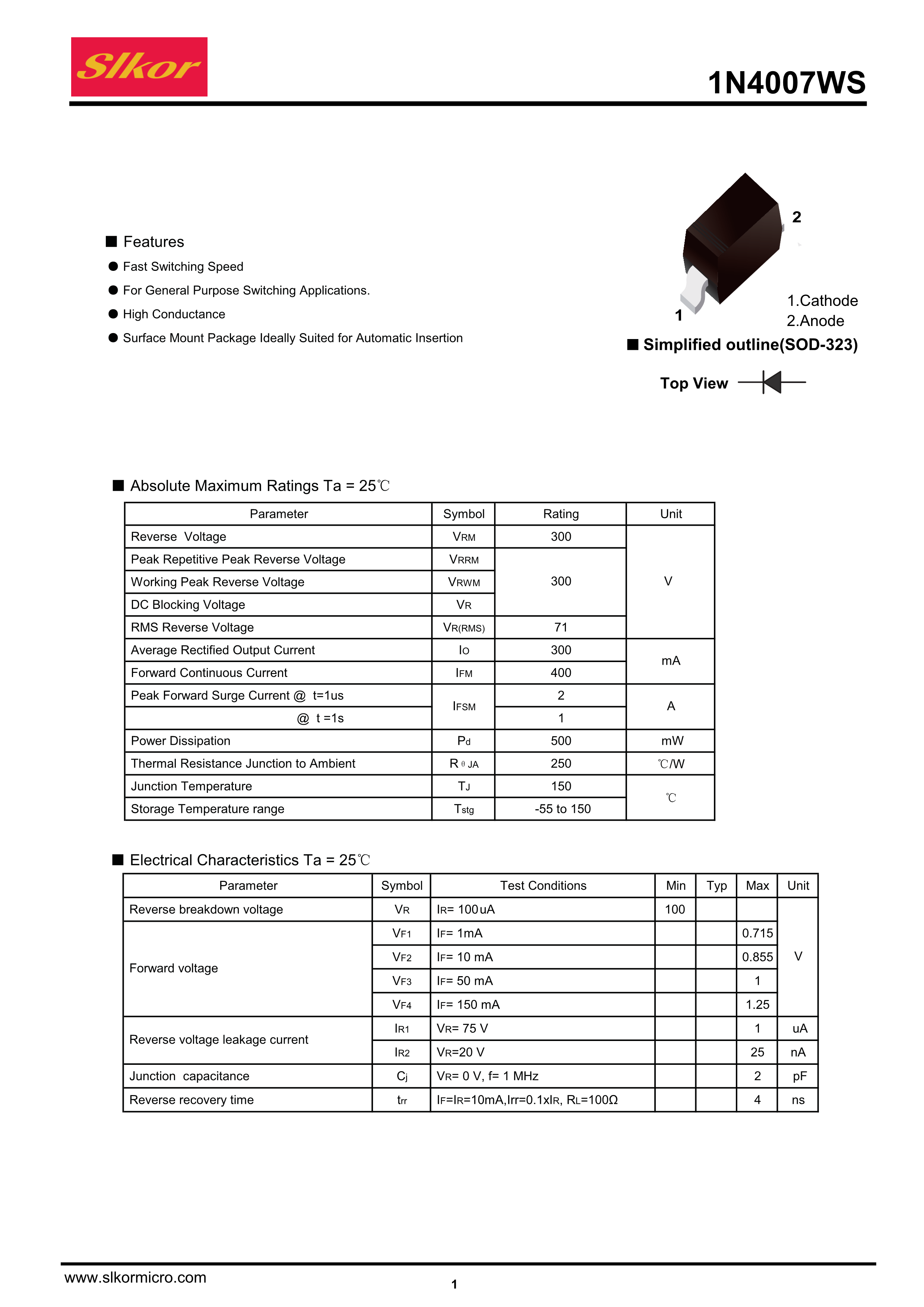 1N4007WS数据手册SOD-323封装Slkor(萨科微)PDF规格书,中英文下载