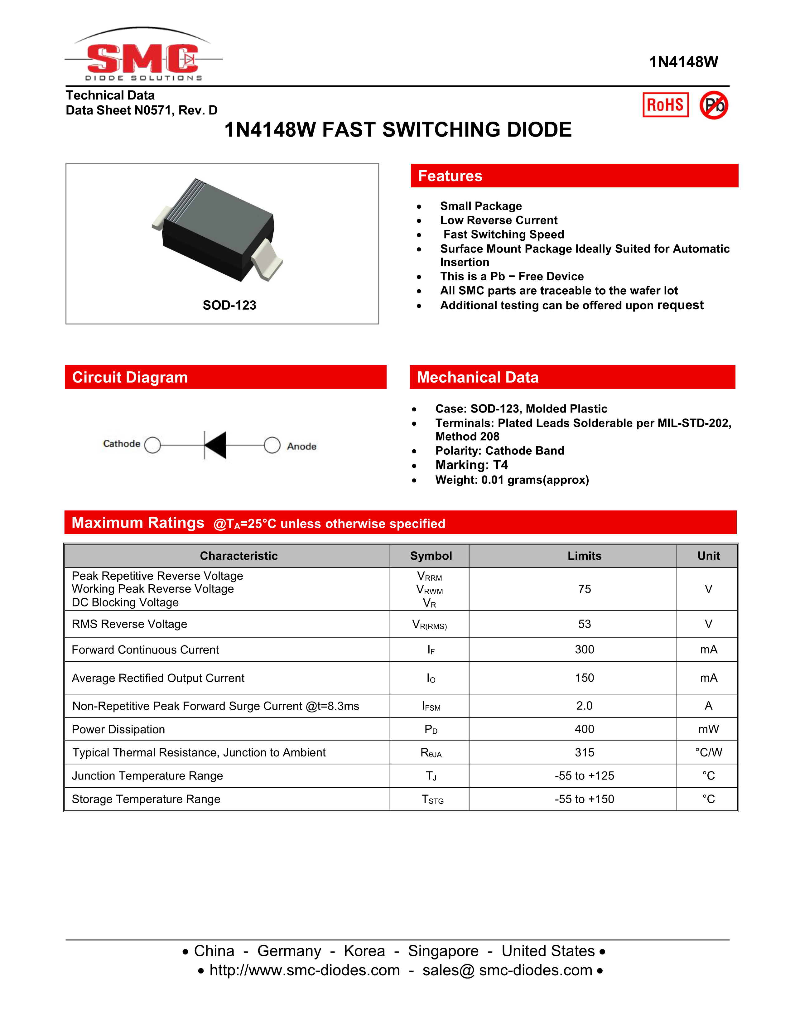 1N4148W数据手册SOD-123封装SMC(桑德斯)PDF规格书,中英文下载