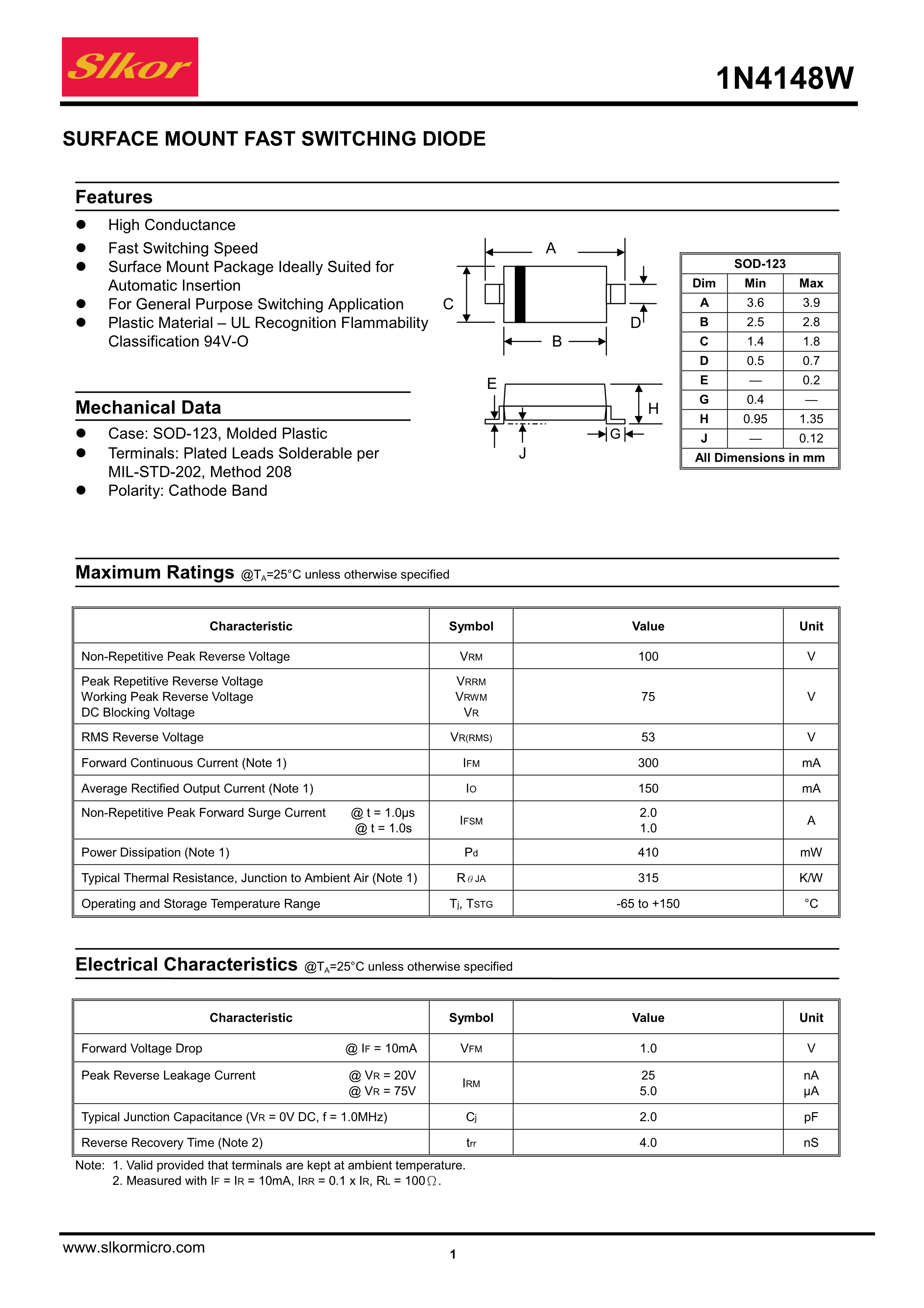 1N4148W数据手册SOD-123封装Slkor(萨科微)PDF规格书,中英文下载