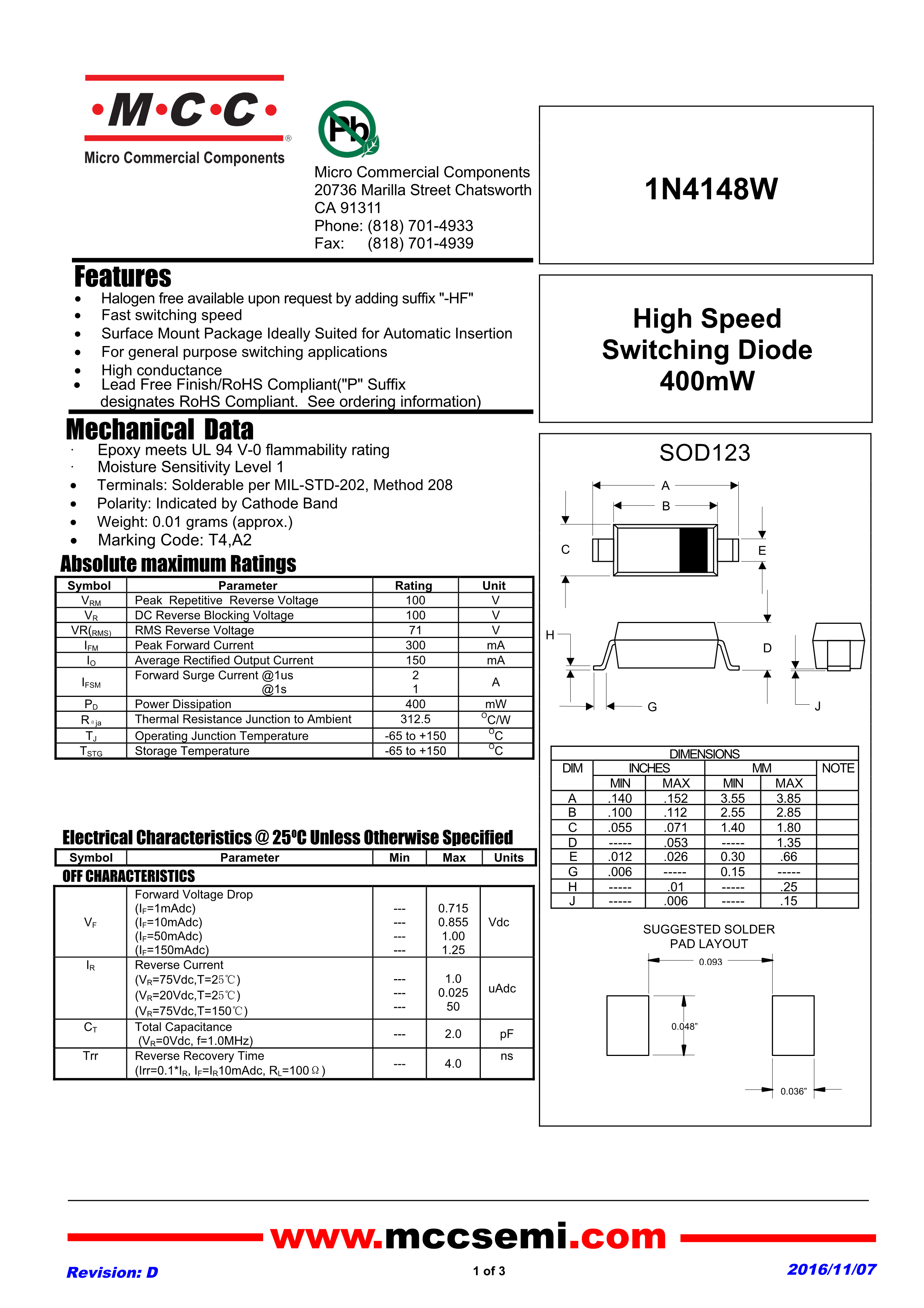 1N4148W-TP数据手册SOD-123封装MCC(美微科)PDF规格书,中英文下载