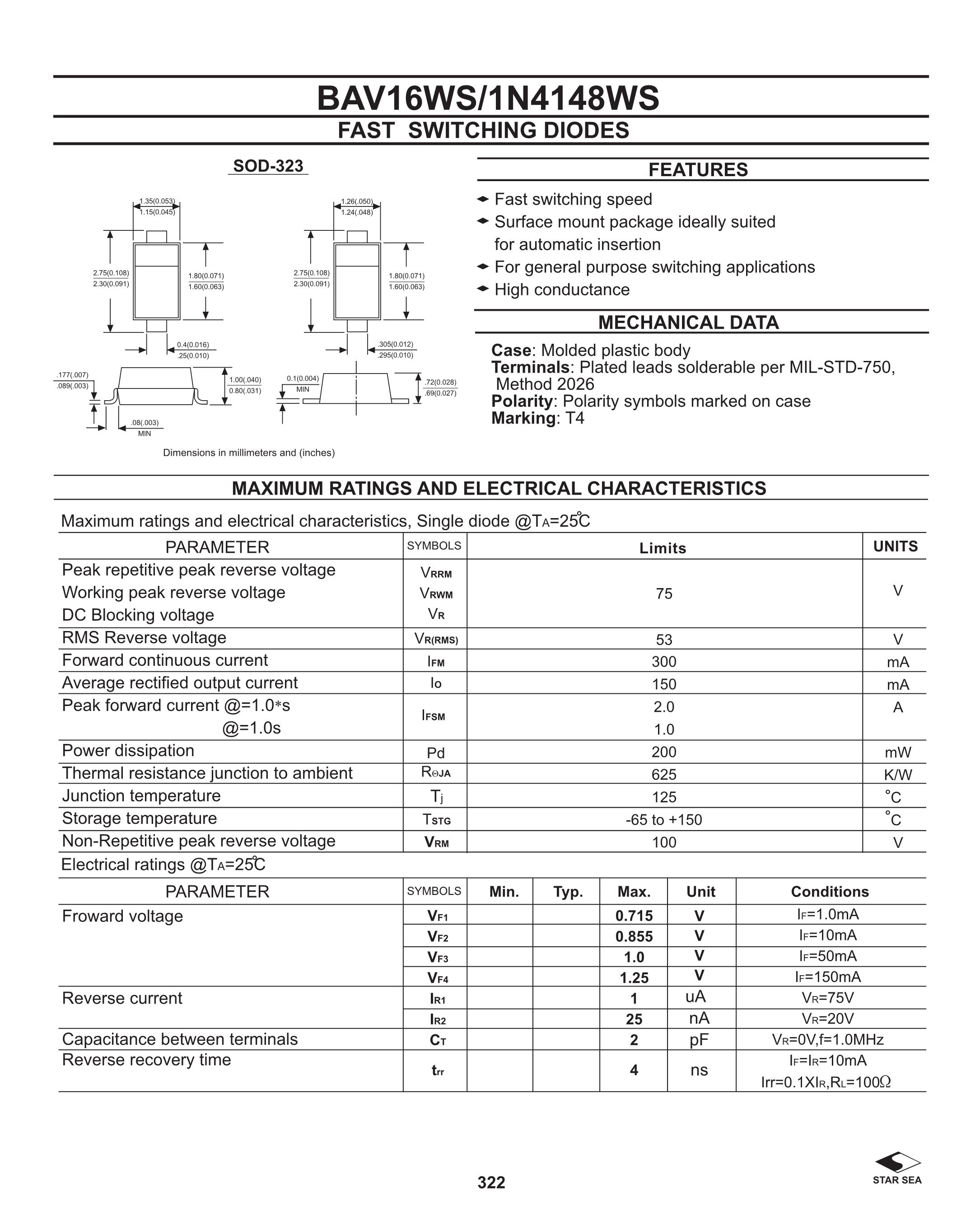1N4148WS数据手册SOD-323封装星海PDF规格书,中英文下载