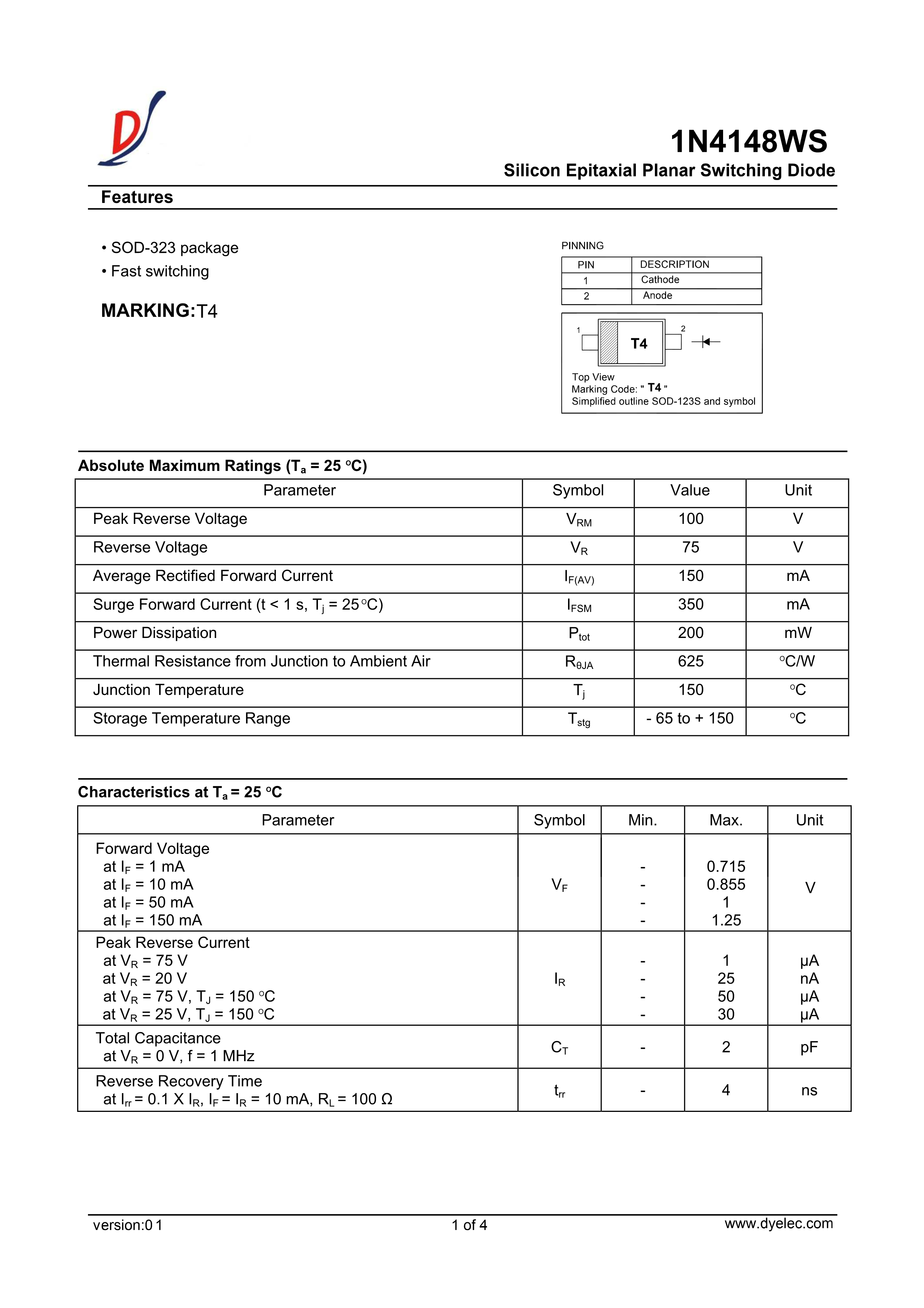 1N4148WS数据手册SOD-323封装迪一PDF规格书,中英文下载