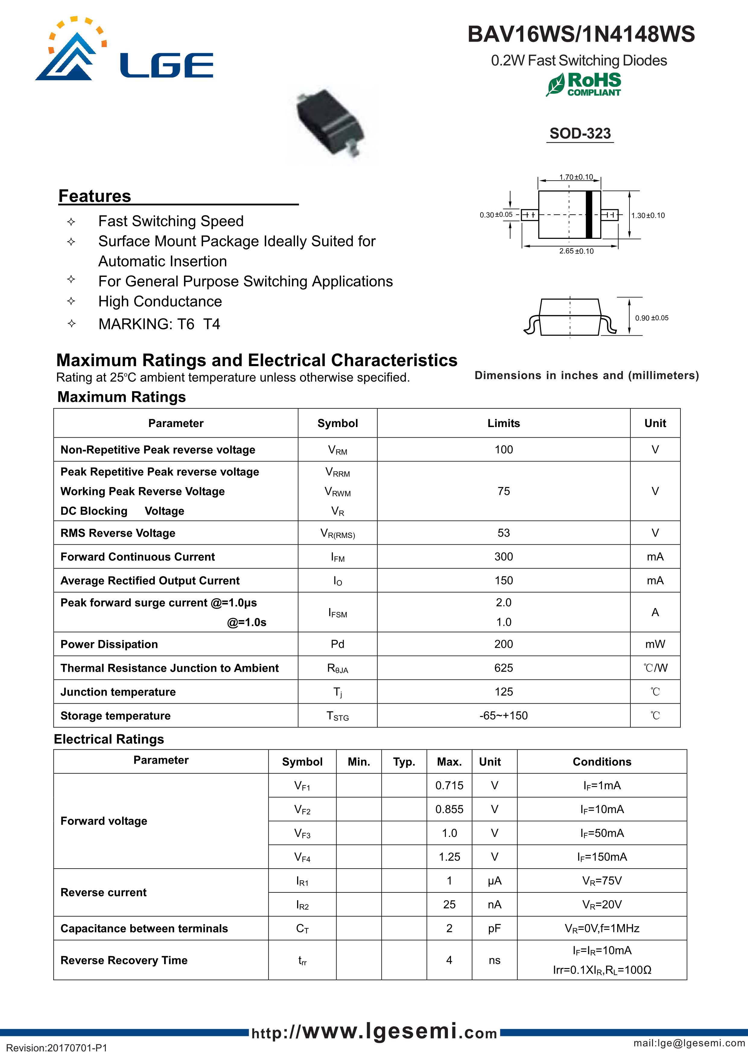 1N4148WS数据手册SOD-323封装LGE(鲁光)PDF规格书,中英文下载
