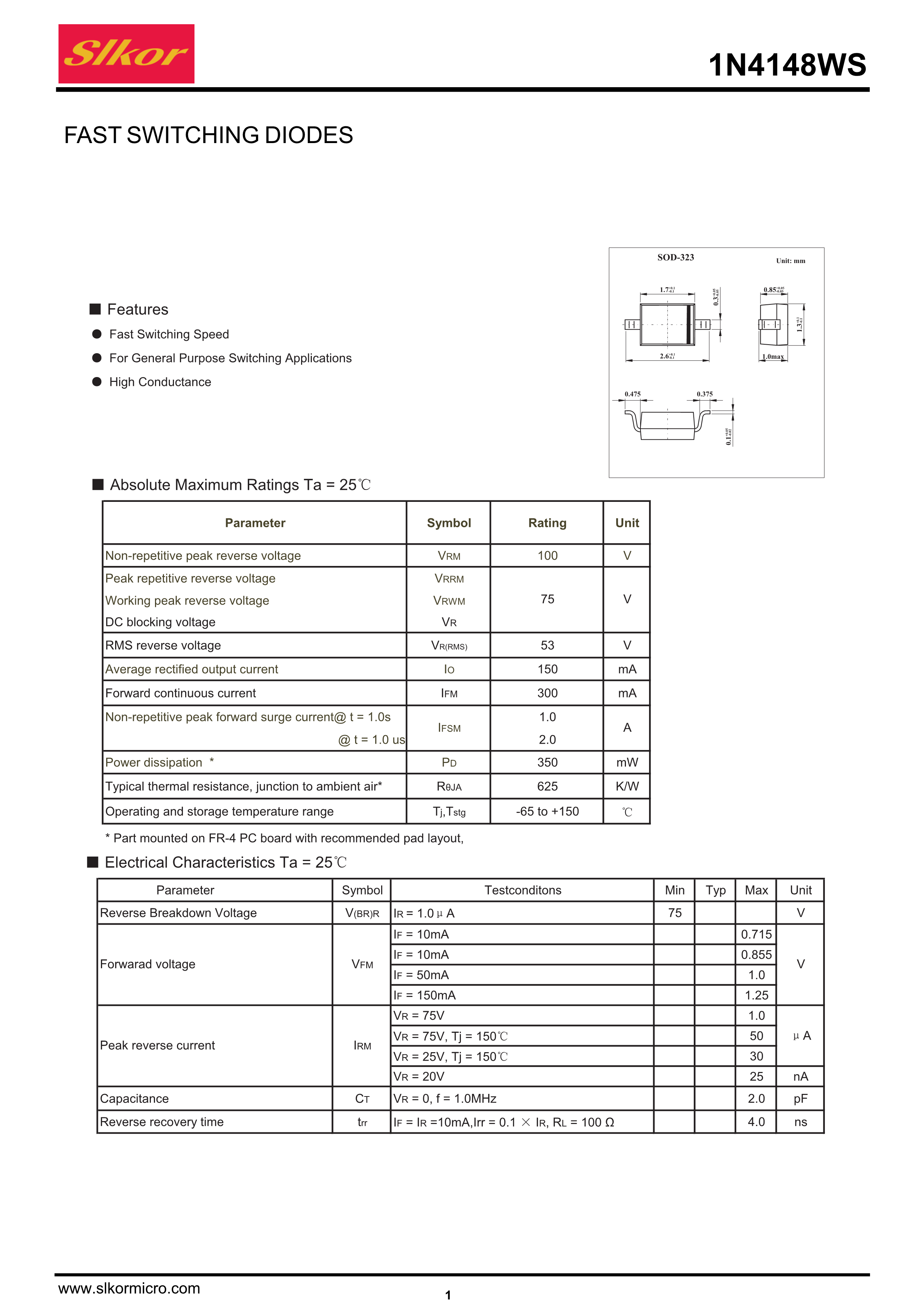 1N4148WS数据手册SOD-323封装Slkor(萨科微)PDF规格书,中英文下载