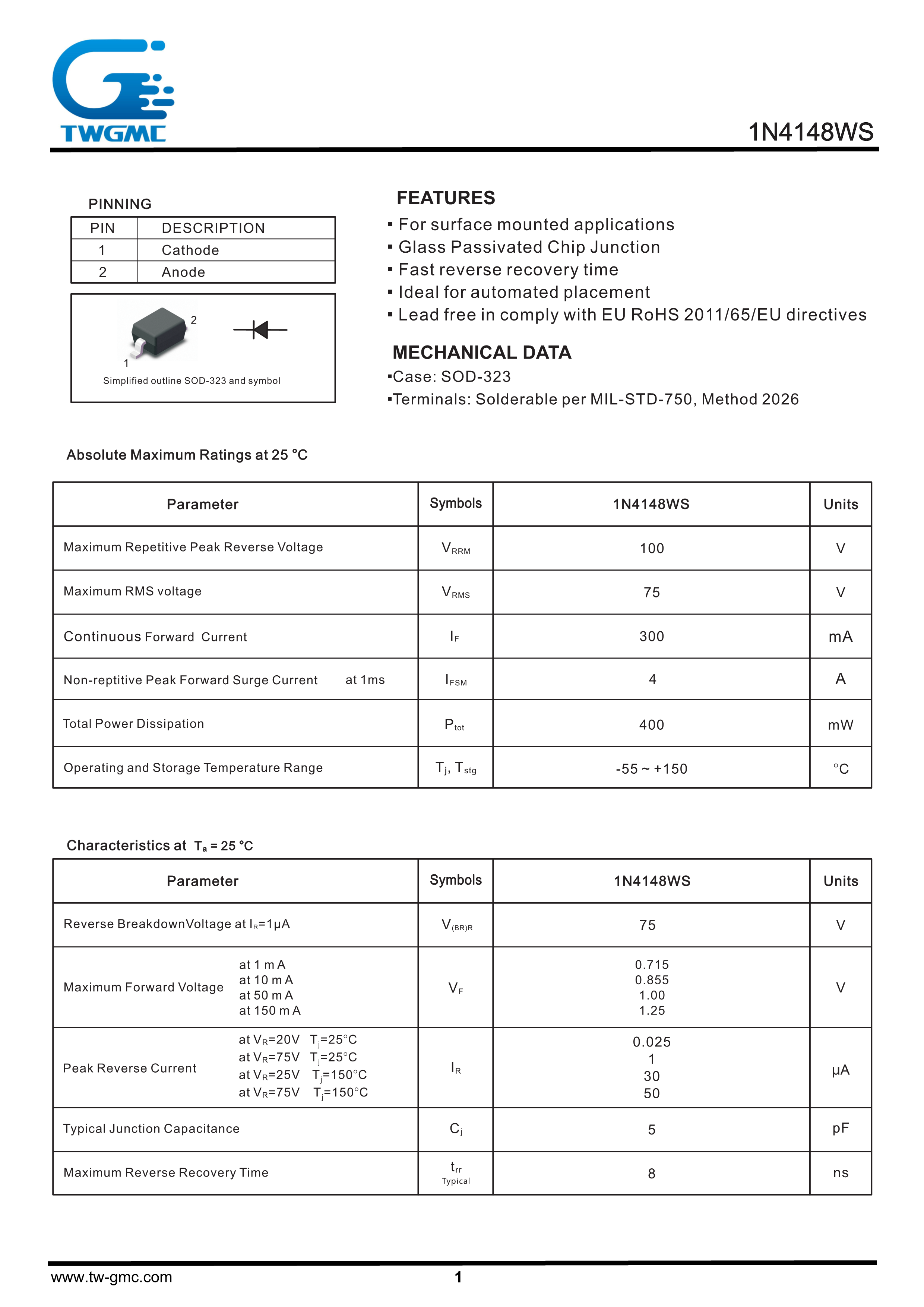 1N4148WS数据手册SOD-323封装TWGMC(台湾迪嘉)PDF规格书,中英文下载